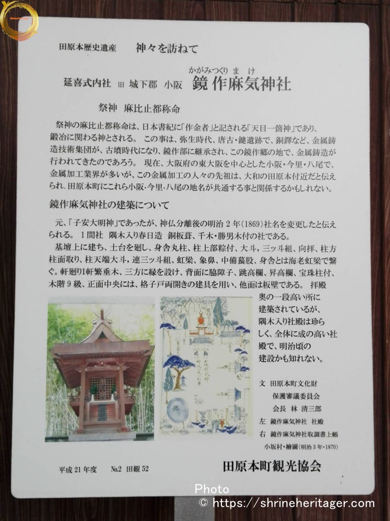 祭神の天麻比止都禰命は、天目一筒命のことで太玉命に隷属した神。天疎降臨の節、金工として従ったが、金工には片目を閉じて一つ目で面や曲や直を調べるのでこの名がある。倭鍛冶等の租神である。『延喜式』神名帳登載の式内社に比定されているが、その頭注に「鏡作麻気神ハ天糠戸命」とある。石凝姥命の親神である。『文徳実録』の仁寿元年(八五一)正月の詔で正六位上に叙せられたとみられる。創建年代は明らかでないがこの地方に住んだ鏡作部が祀った社と考えられる。