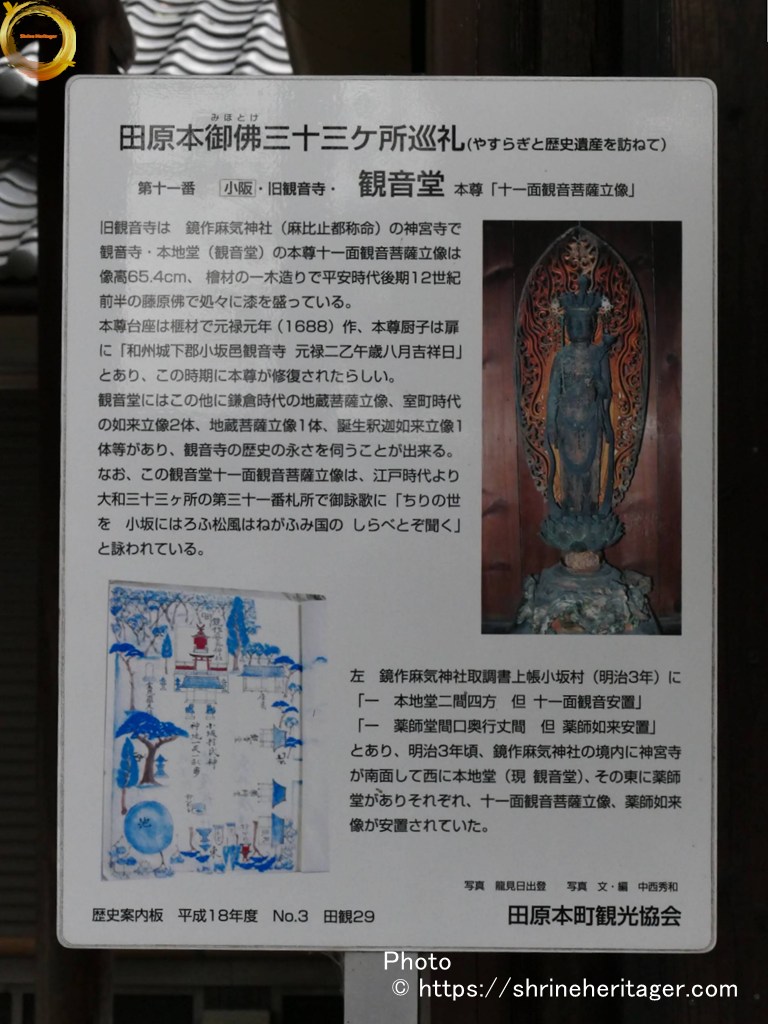 旧観音寺は 鏡作麻気神社(麻比止都称命)の神宮寺で観音寺・本地堂(観音堂)の本尊十一面観音菩薩立像は像高65.4cm、檜材の一木造りで平安時代後期12世紀前半の藤原佛で処々に漆を盛っている。
