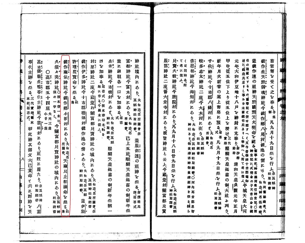 式内社 鏡作麻氣神社について 所在は゛小坂村に在す、今 春日と称す、゛〈現 鏡作麻氣神社(田原本町小阪)〉と記しています