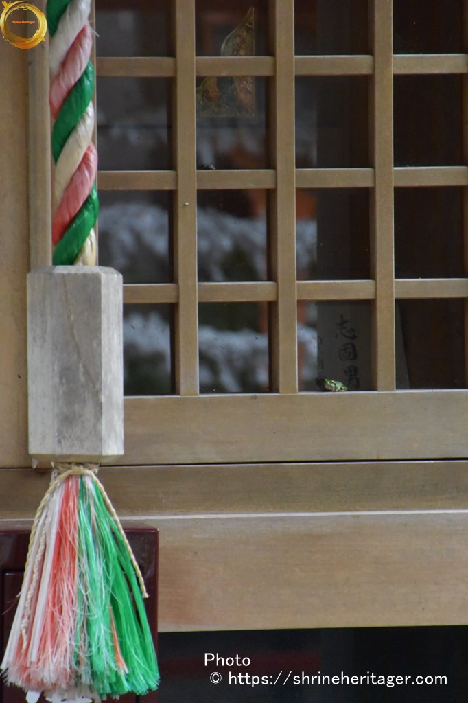 社殿部分は一間四方で、組み物は三斗組二手先で、かえるまたには透かし彫りの彫刻が入っています。