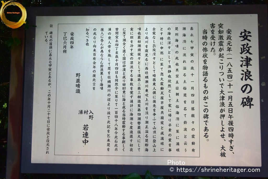 宝永の大地震の時、津波により社殿が浸水し浮くという被害にあいましたが、津波が引くと寸分たがわず元の場所に戻ったという言い伝えが残っています。また、境内には「安政津波の碑」があり、大地震に備えるよう後世への警告を伝えています。