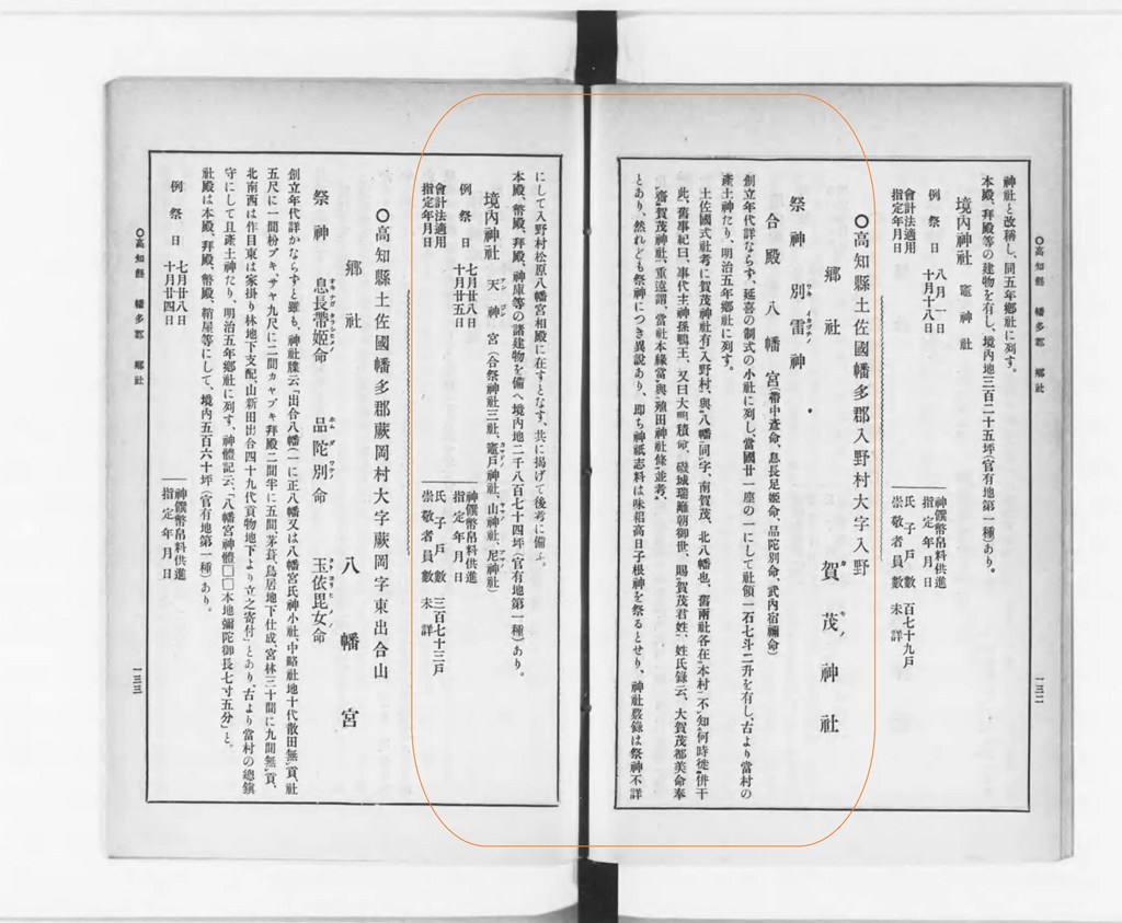 土佐國式社考に 賀茂神社有 入野村、與 八幡同字、南賀茂、北八幡也、舊兩社各在ニ 本村 不知ニ 何時徒ニ 併干此、舊事紀曰、事代主神孫 鴨王、又曰 大鴨積命、磯城瑞籬朝御世、賜ニ 賀茂君姓、姓氏録云、大賀茂都美命 奉齋賀茂神社、重遠謂、當社本緣當與ニ 殖田神社條並考、