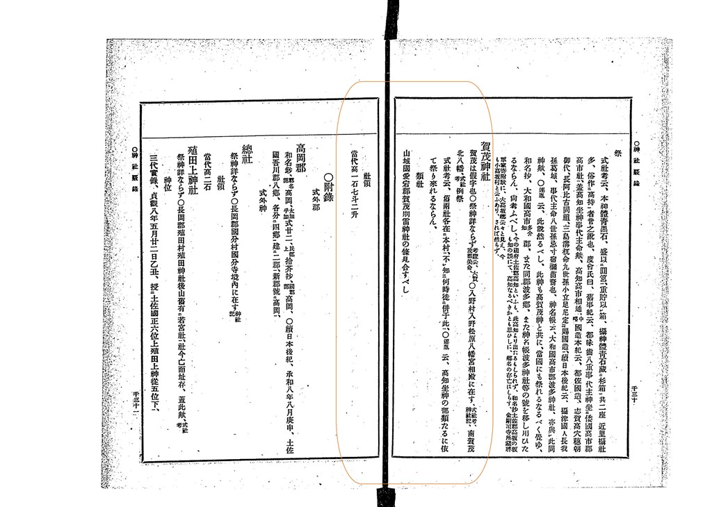 〔参酌古事記、新撰姓氏録、延喜式、○按 舊事本紀、都佐國造の祖 三島溝杭命は、實に事代主命の裔也、又按 延喜式 大和高市郡 高市御縣坐鴨事代主神社あるを合せ考ふるに、此の高知賀茂二神 疑らくは、國造族類の祭れる神にはあらじ歟、姑く附て考に備ふ、〕