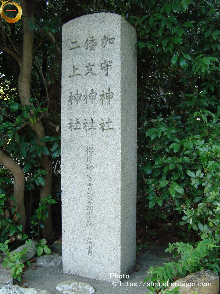 二上山の北麓 加守に鎮守の社を、式内大社にあてられ、主神に天羽雷命、相殿の加守神社に天忍人命と二上神社に天国魂命を祀る。