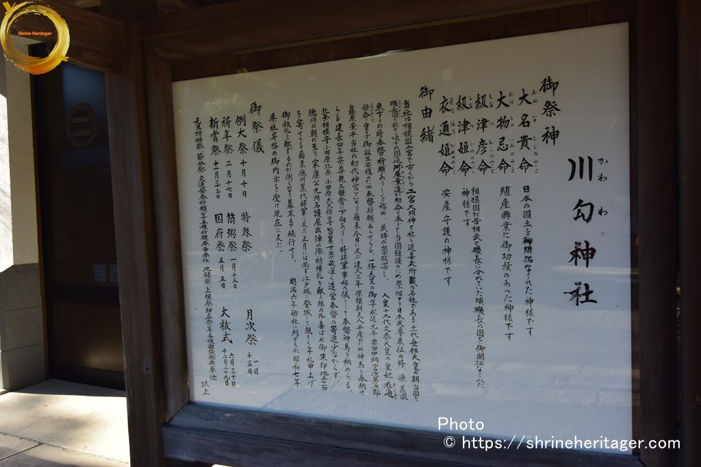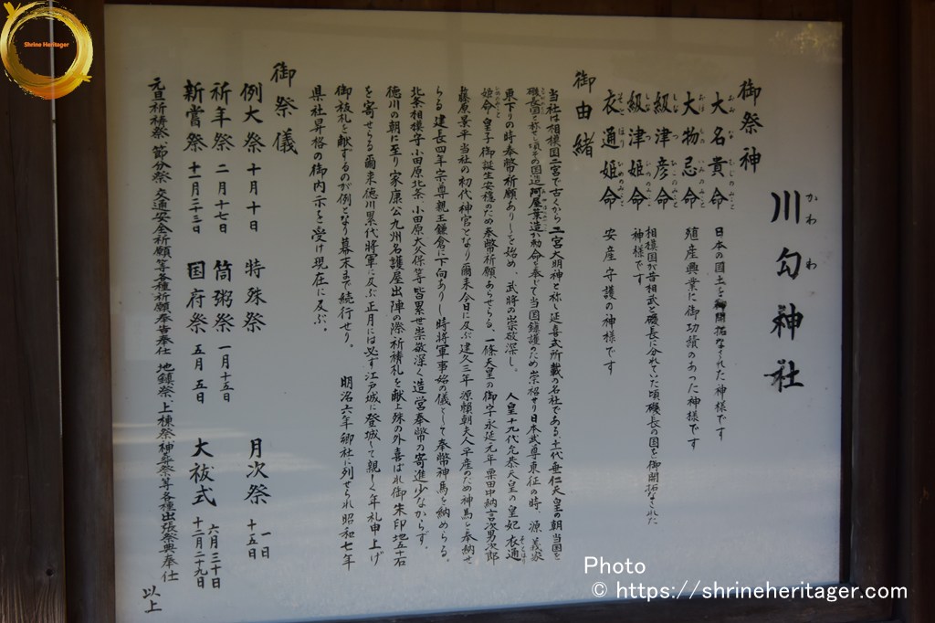 川勾神社(かわわじんじゃは 社伝に「縁起書によれば 第十一代垂仁天皇の朝 磯長国(しながのくに)の国宰たる阿屋葉造が勅命を奉じて当国鎮護のため創祀せらる」とあり 日本武尊東征の時 源義家東下りの時 奉幣祈願があったと伝わる 延喜式内社 相模國 餘綾郡 川匂神社(かはいいの かみのやしろ)です