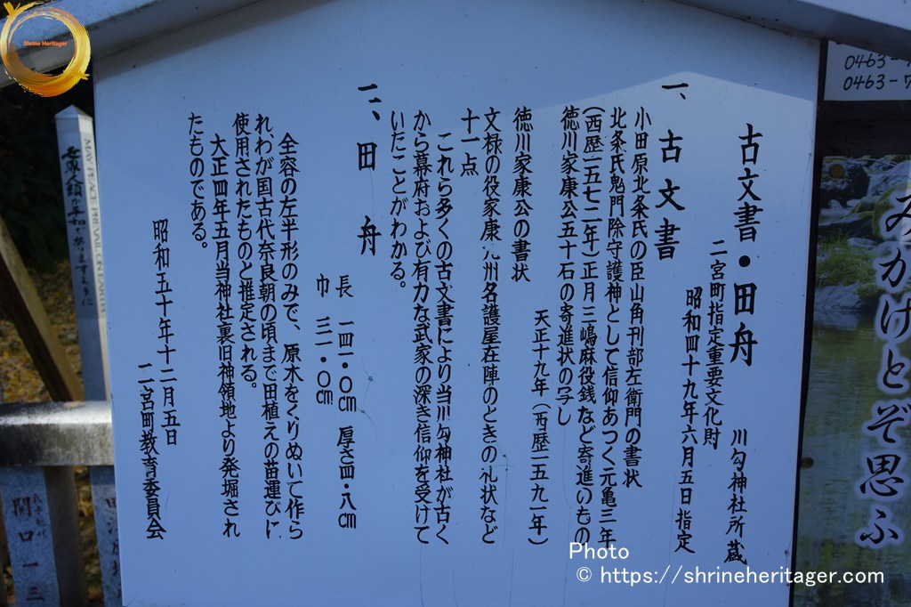 田船(丸木船)(二宮町重要文化財)長さ 4尺8寸 巾 7寸8分 厚さ 1寸5分 大正4年旧神領地の水田より発掘されたものにして左半形をとどめて居る、原木をくりぬいたものであり奈良時代のものと推定さる。
