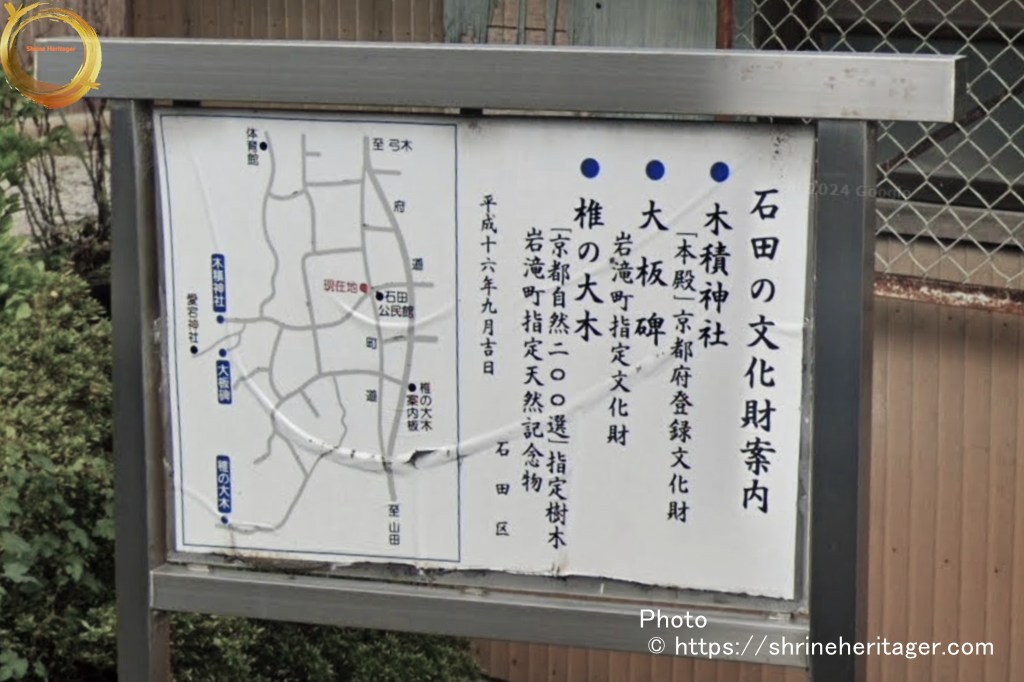 石田地区の旧道沿い 石田公民館辺りに 社号標「式内 木積神社」が立っていて 参道の入口があります