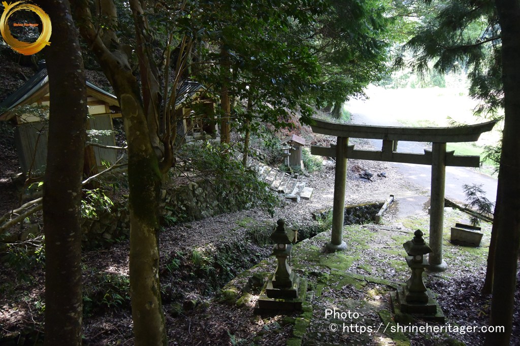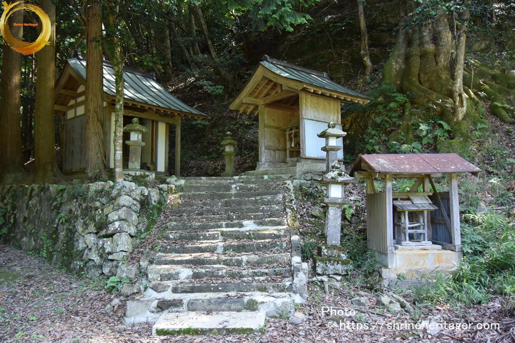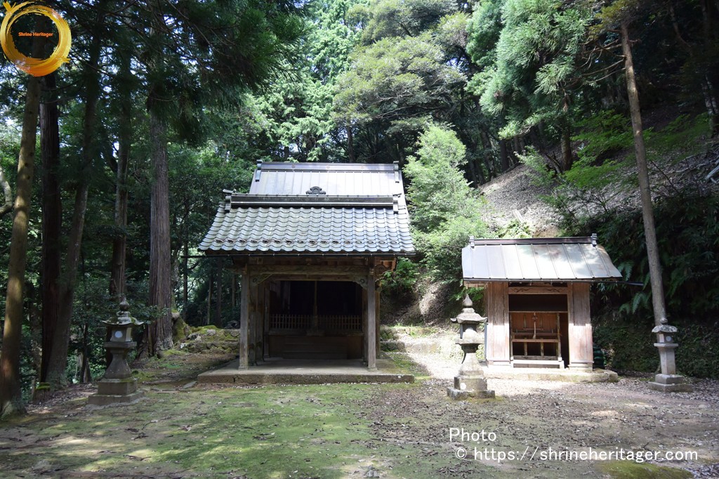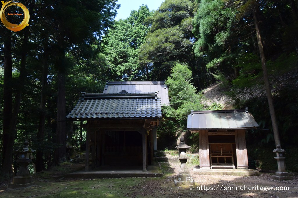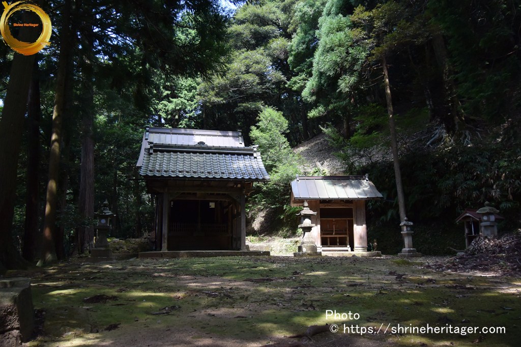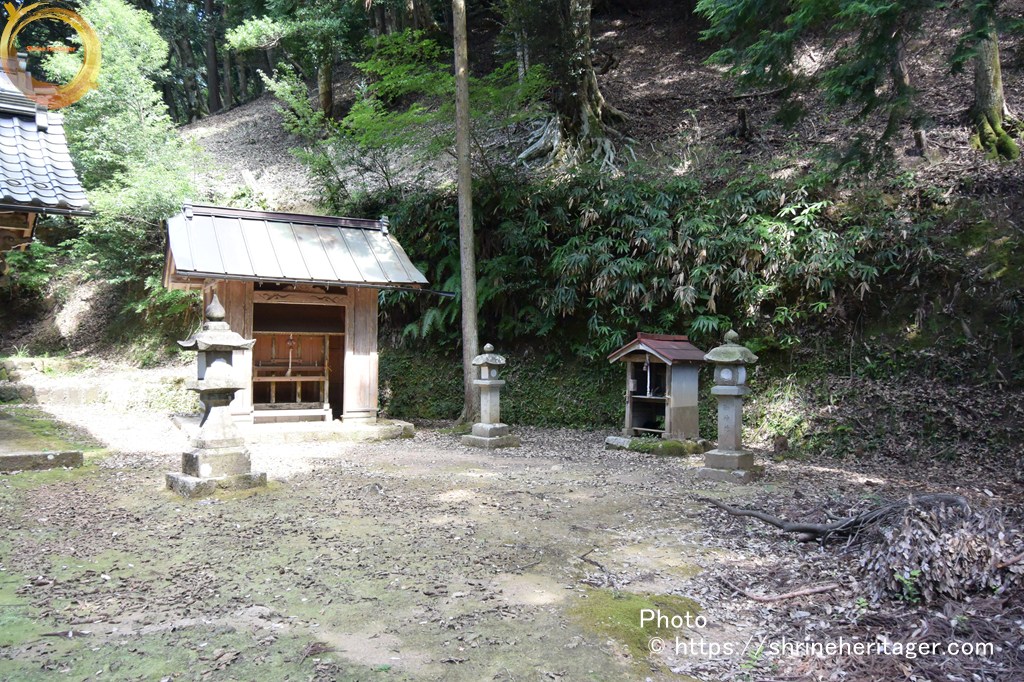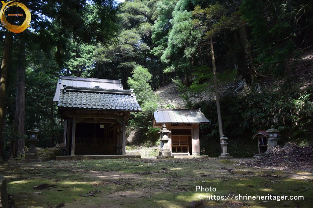 境内坪數二、九七坪。本殿流造屋根板葺建坪二坪四合一句、上屋切妻造板葺建坪七坪一合四勺、拜殿切妻造瓦葺建坪二坪一合九勺、屋切妻造本瓦葺建坪四坪八合九勺、境内神社四社。神社より約四〇〇メートル離れた道傍に大きな岩石四個あり、最も大きいのは長四メートル、幅三メートルで、いづれも人馬の足跡を印し、熊野新宮の休息された舊蹟であると傳へてゐる。延享二年(一七四五)供養のため碑を建てたが、今もその一片を残してゐる。