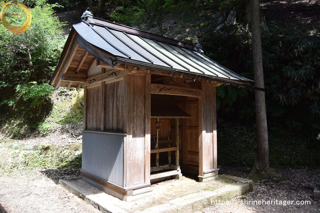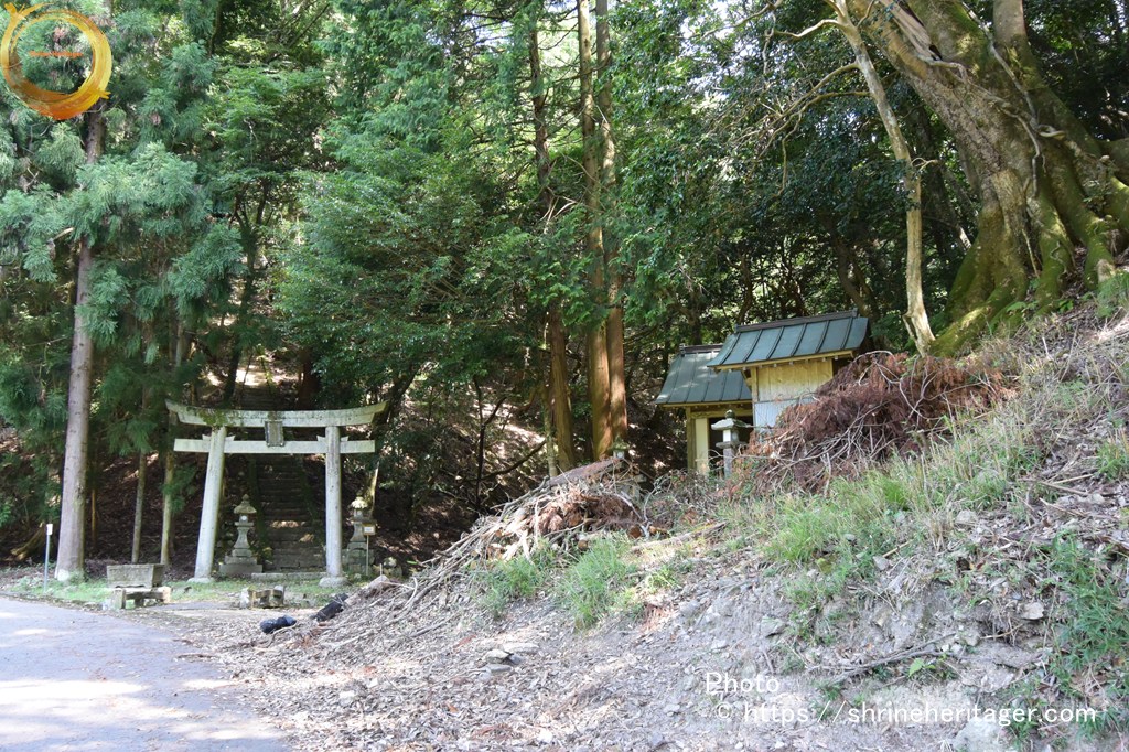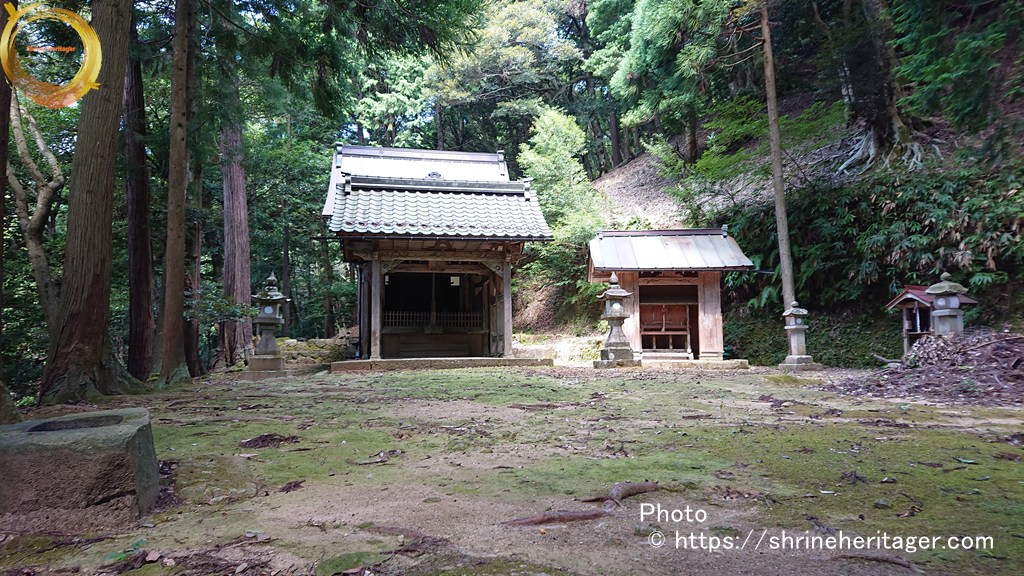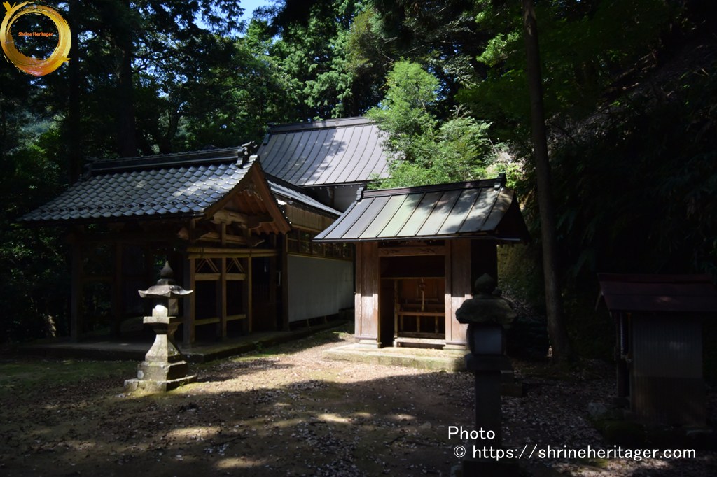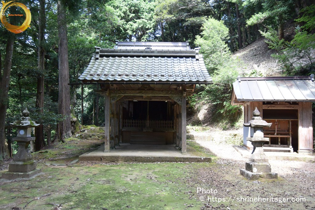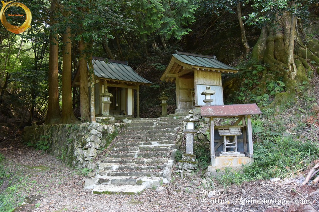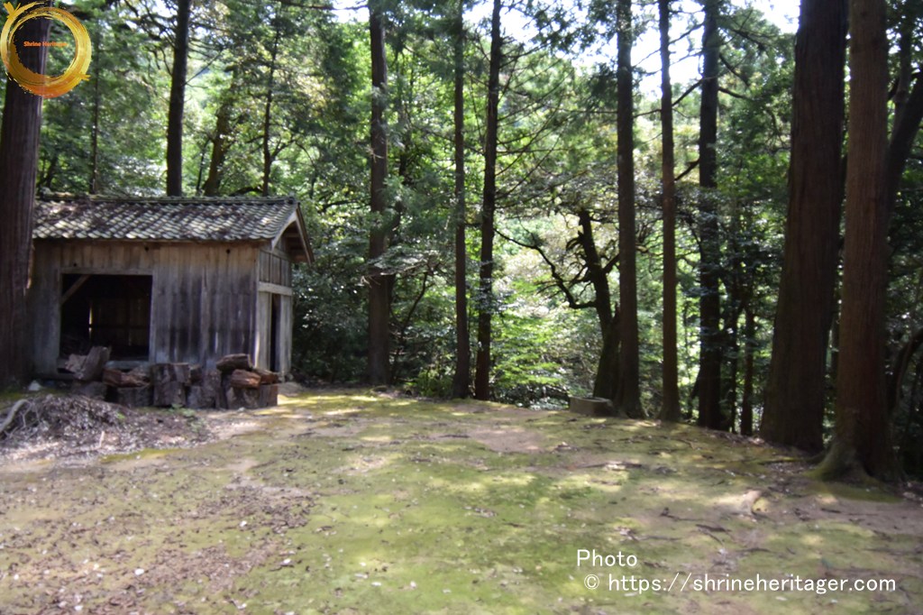 境内坪數二、九七坪。本殿流造屋根板葺建坪二坪四合一句、上屋切妻造板葺建坪七坪一合四勺、拜殿切妻造瓦葺建坪二坪一合九勺、屋切妻造本瓦葺建坪四坪八合九勺、境内神社四社。神社より約四〇〇メートル離れた道傍に大きな岩石四個あり、最も大きいのは長四メートル、幅三メートルで、いづれも人馬の足跡を印し、熊野新宮の休息された舊蹟であると傳へてゐる。延享二年(一七四五)供養のため碑を建てたが、今もその一片を残してゐる。