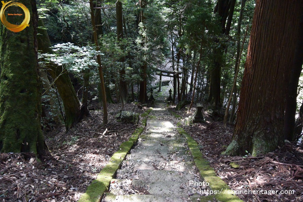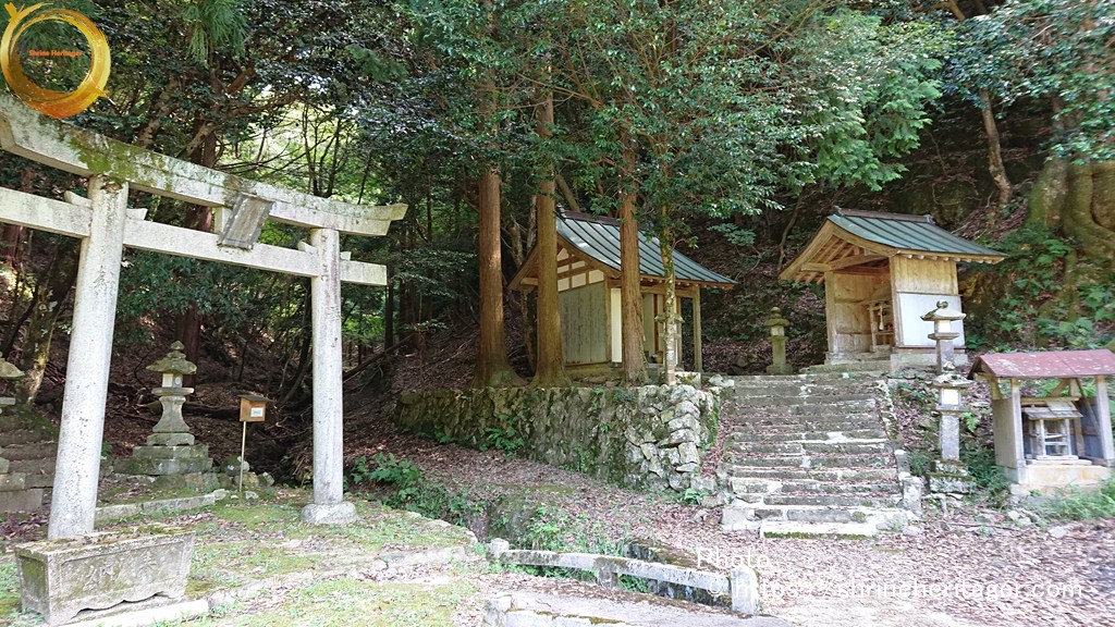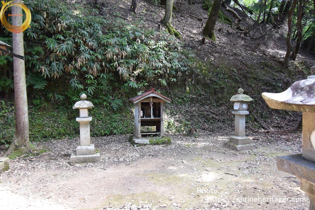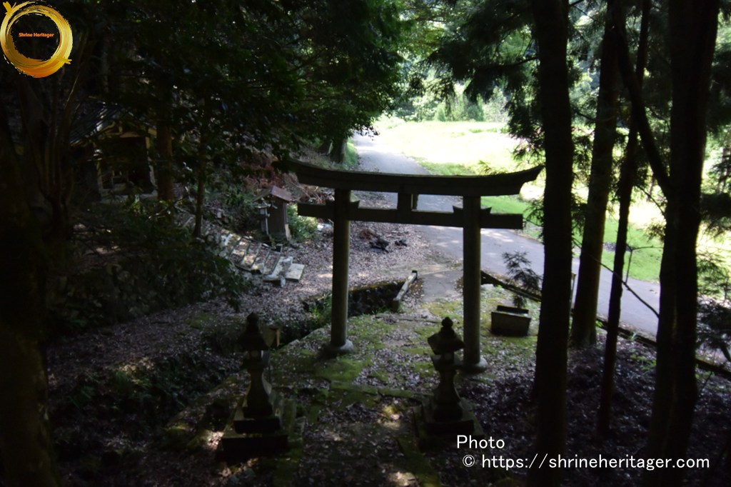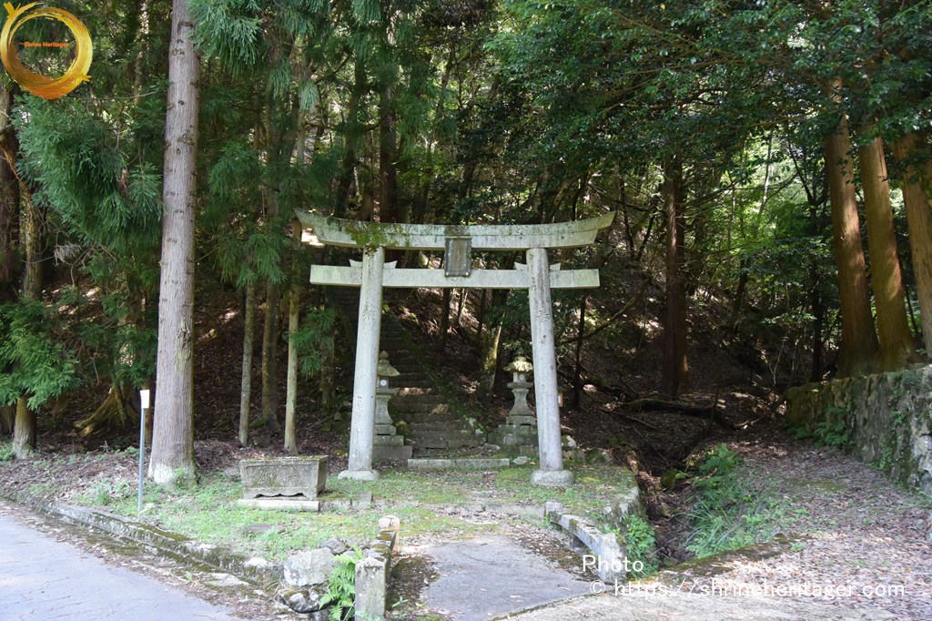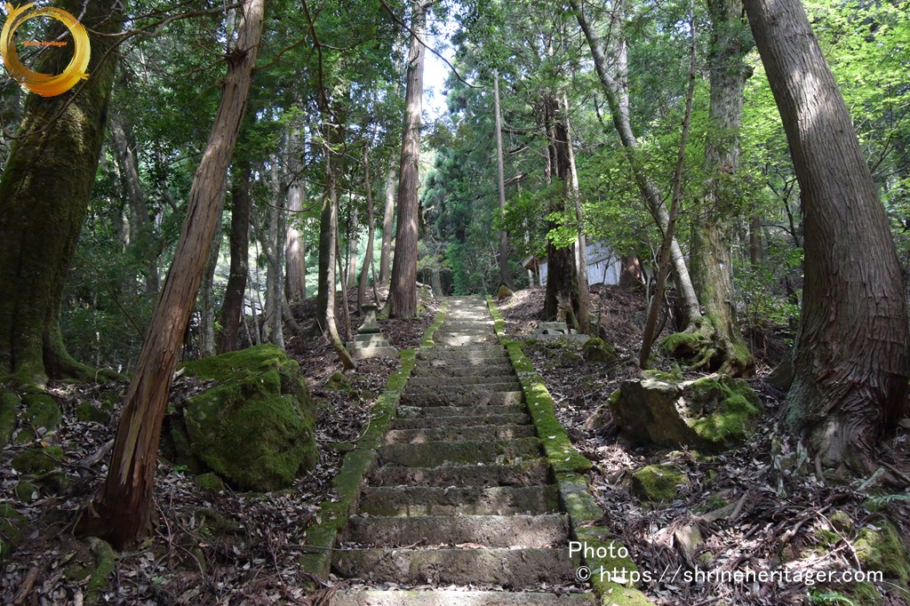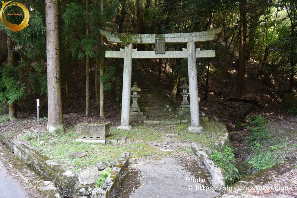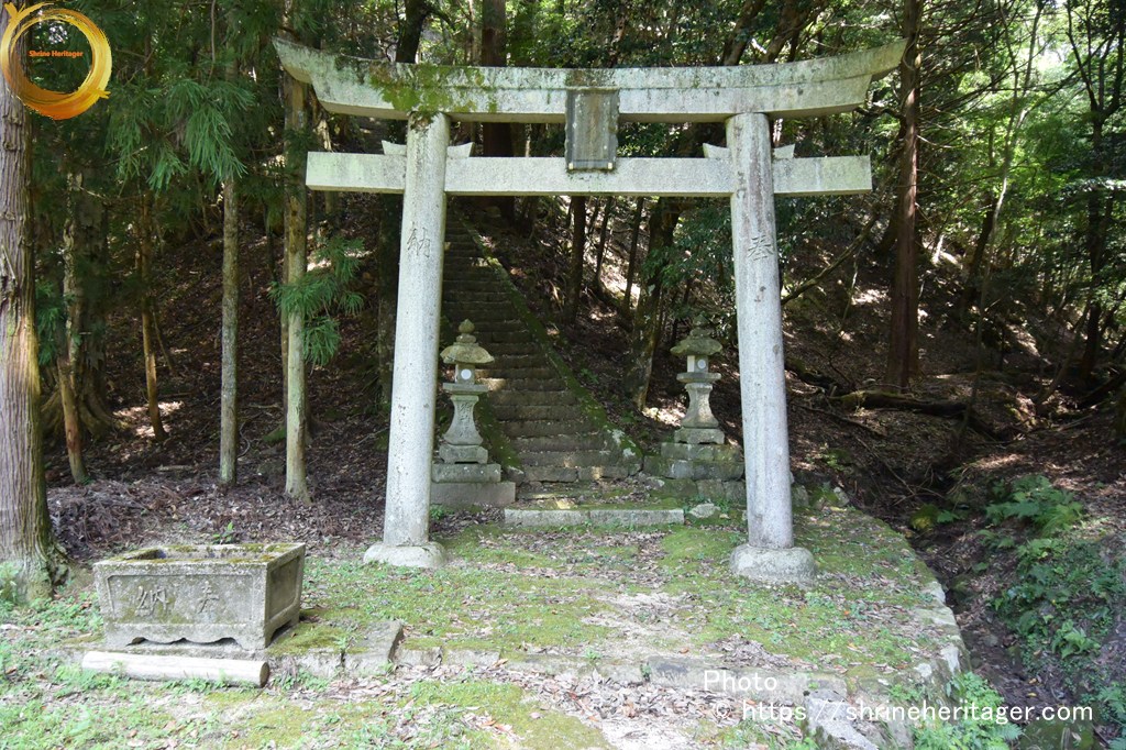 境内坪數二、九七坪。本殿流造屋根板葺建坪二坪四合一句、上屋切妻造板葺建坪七坪一合四勺、拜殿切妻造瓦葺建坪二坪一合九勺、屋切妻造本瓦葺建坪四坪八合九勺、境内神社四社。神社より約四〇〇メートル離れた道傍に大きな岩石四個あり、最も大きいのは長四メートル、幅三メートルで、いづれも人馬の足跡を印し、熊野新宮の休息された舊蹟であると傳へてゐる。延享二年(一七四五)供養のため碑を建てたが、今もその一片を残してゐる。