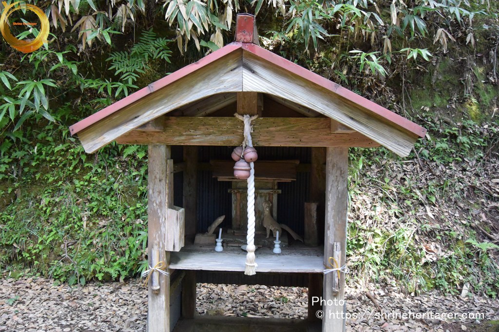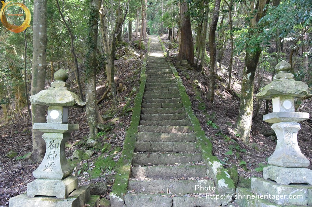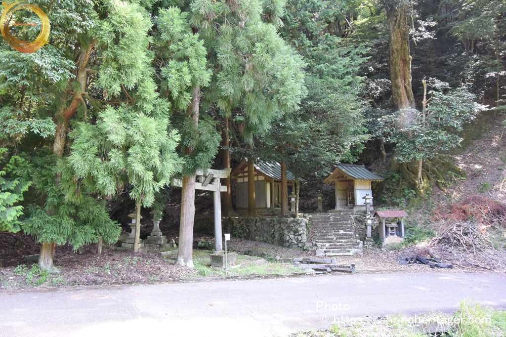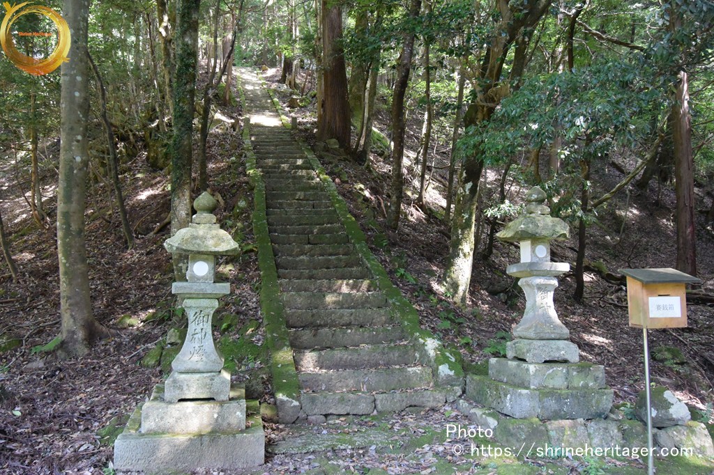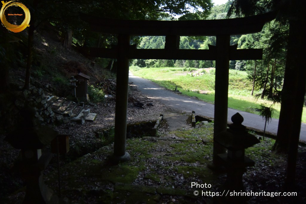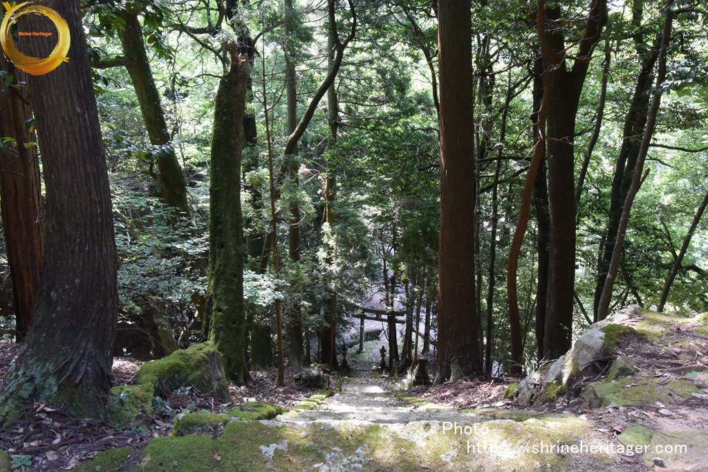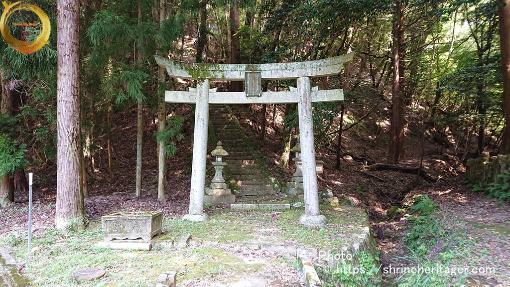 境内坪數二、九七坪。本殿流造屋根板葺建坪二坪四合一句、上屋切妻造板葺建坪七坪一合四勺、拜殿切妻造瓦葺建坪二坪一合九勺、屋切妻造本瓦葺建坪四坪八合九勺、境内神社四社。神社より約四〇〇メートル離れた道傍に大きな岩石四個あり、最も大きいのは長四メートル、幅三メートルで、いづれも人馬の足跡を印し、熊野新宮の休息された舊蹟であると傳へてゐる。延享二年(一七四五)供養のため碑を建てたが、今もその一片を残してゐる。