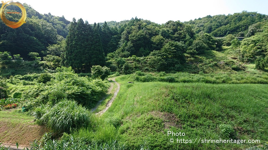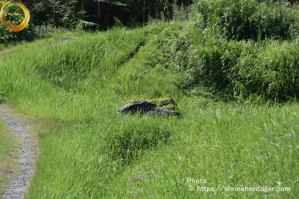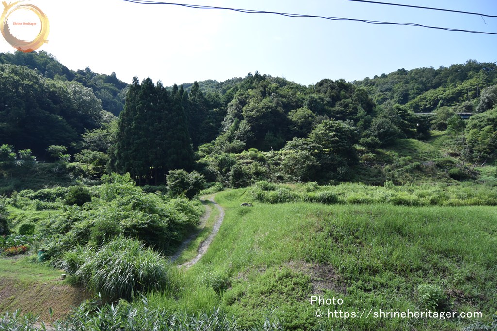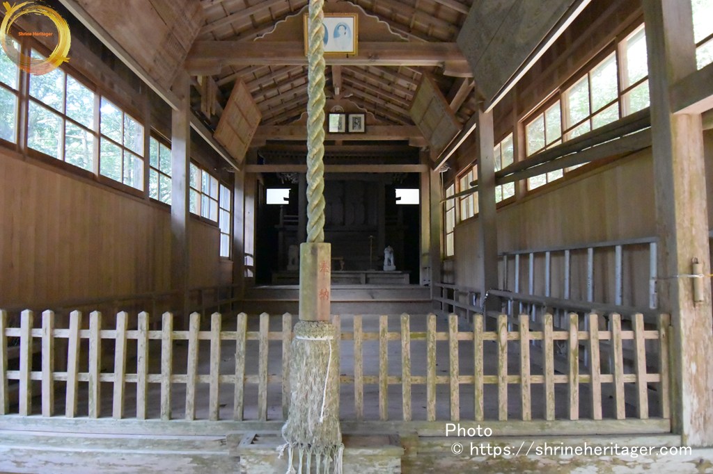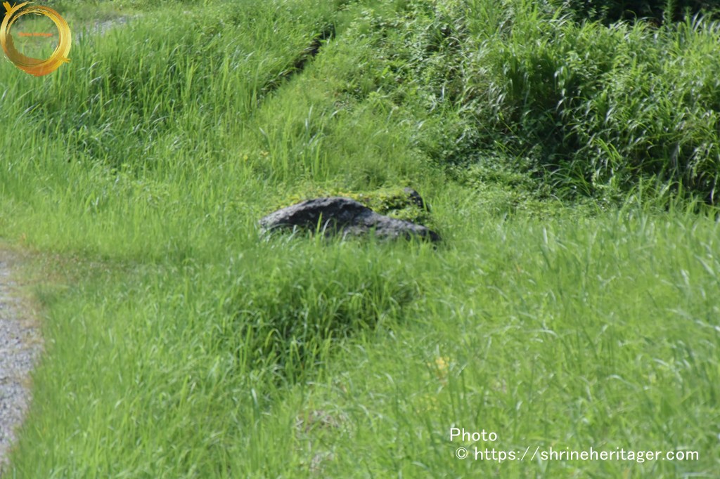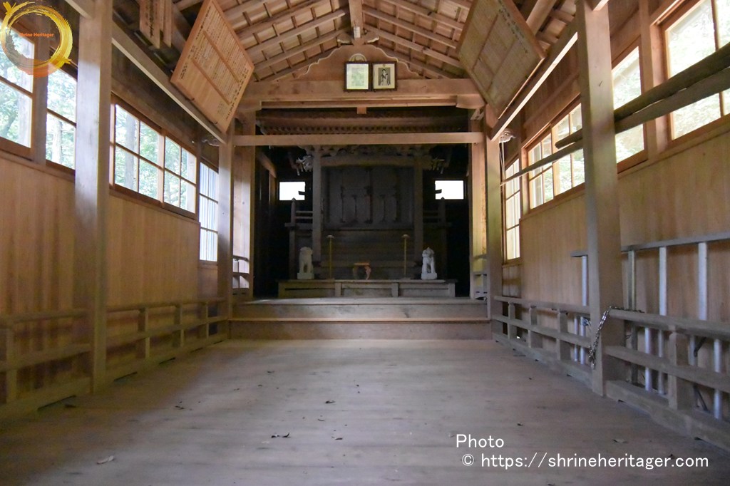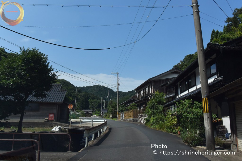 境内坪數二、九七坪。本殿流造屋根板葺建坪二坪四合一句、上屋切妻造板葺建坪七坪一合四勺、拜殿切妻造瓦葺建坪二坪一合九勺、屋切妻造本瓦葺建坪四坪八合九勺、境内神社四社。神社より約四〇〇メートル離れた道傍に大きな岩石四個あり、最も大きいのは長四メートル、幅三メートルで、いづれも人馬の足跡を印し、熊野新宮の休息された舊蹟であると傳へてゐる。延享二年(一七四五)供養のため碑を建てたが、今もその一片を残してゐる。