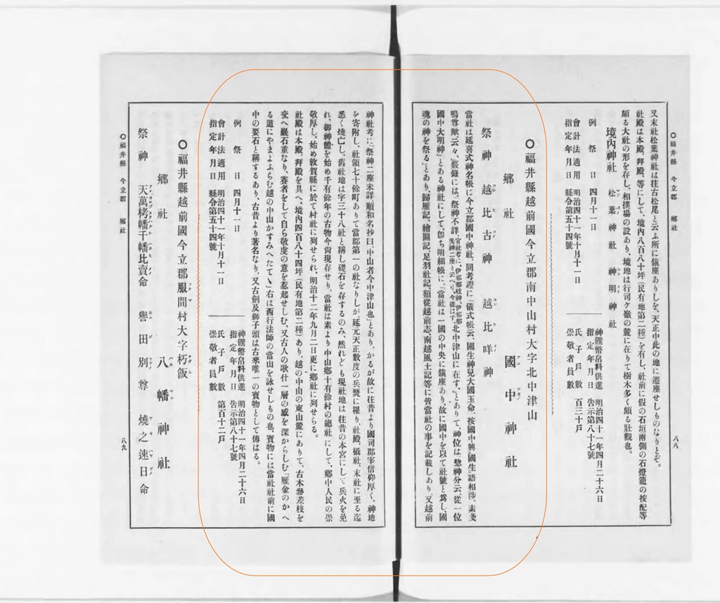式内社 國中神社二座について 所在は゛北中津山村に在す、〈現 国中神社(越前市国中町)〉と記しています