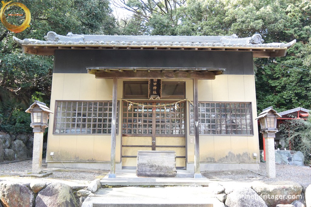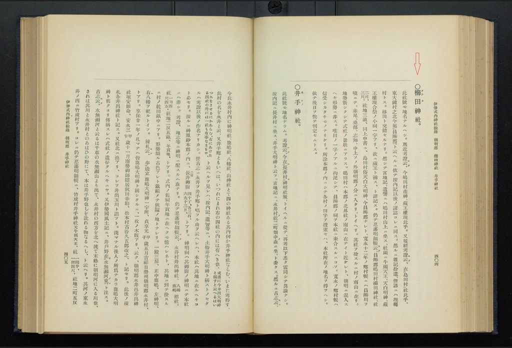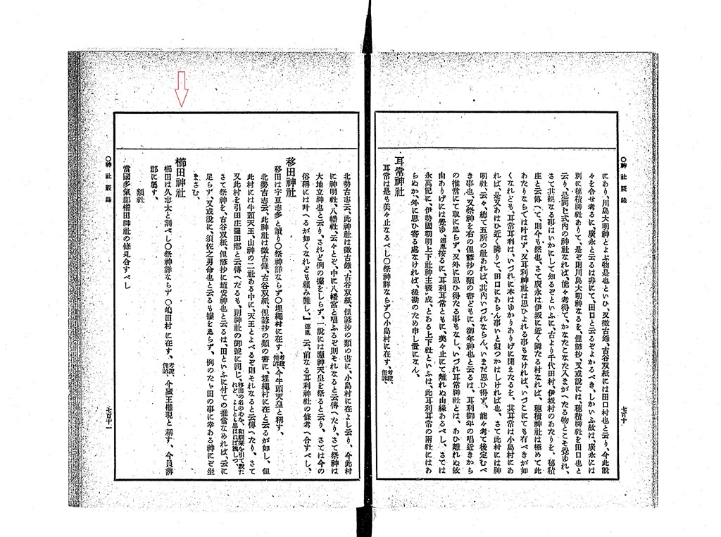 其社ヲ檢スルニ村ノ南山ニ在リ。地勢新シクシテ式社ノ景狀ニアラス。嶋田村ハ本郡ノ北界社ノ南山ニ在テ イト近ケレト、朝明ニ混入スへキ形勢ニ非ス。唯田ノー字ノアルニ抅泥シテ、員辨郡ノ祠ヲ本社ニ牽合スルニコソ。
