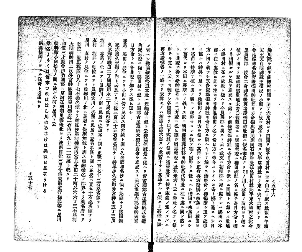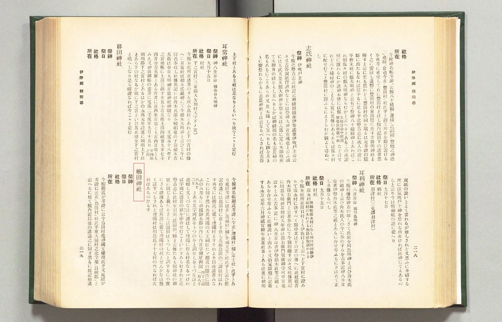 度會延經 神名帳考證 櫛田神社奇日方命 櫛與奇同訓同石部神社 在 島田村社此乎東大鏡村之 今属 員辨郡 度會二身 神名帳再考證 櫛田神社 櫛ハ 假名來爲ナリナリ ノ用用 移田ノ苗代ヨリ越ル植ルノ田ナリ 祀神 稻靈 社地未考