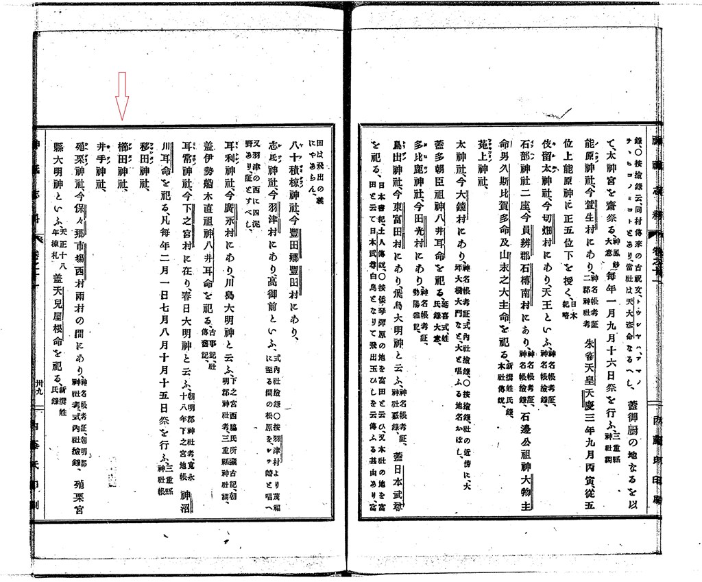 説として゛今 烏田村 産神 藏王権現此乎゛〈現 櫛田神社(桑名市島田)〉を挙げていますが゛唯 田のー字のあるに泥みて員辨郡の祠を本社に牽合するは信受し難きことなり゛として受け入れられないとも記しています