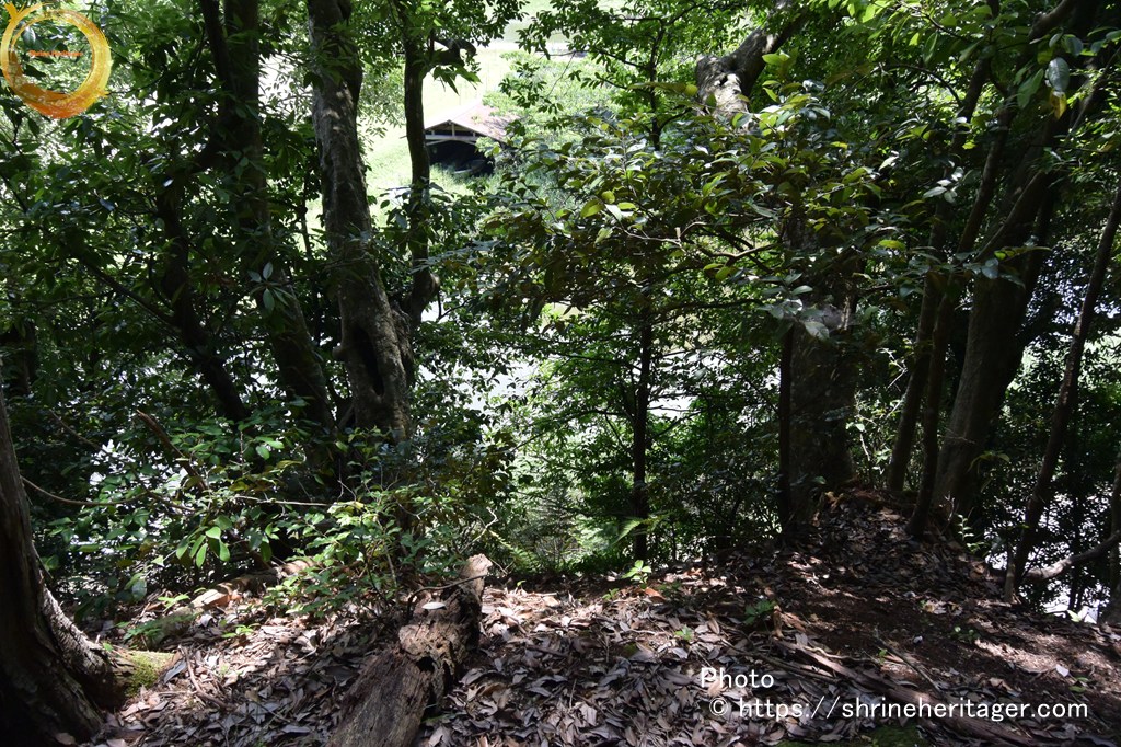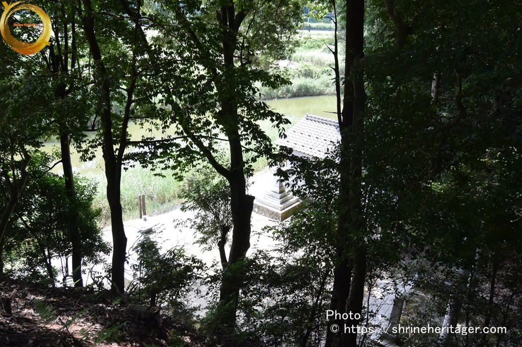 神社と磐座(イワクラ)との中間に 古代祭祀遺蹟があり 正面の対岸には矢田神社の御旅所 拝岩(オガミイワ)がある。