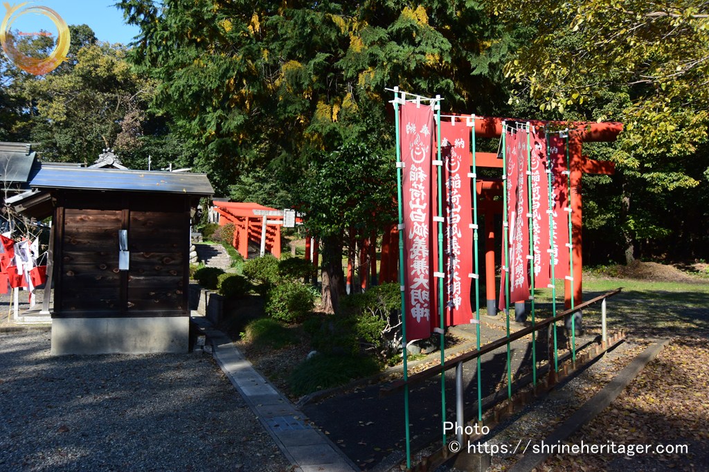 右奥に見えていた稲荷の赤鳥居に近づくと「稲荷山白狐義兼大明神」の幟旗が並んでいます