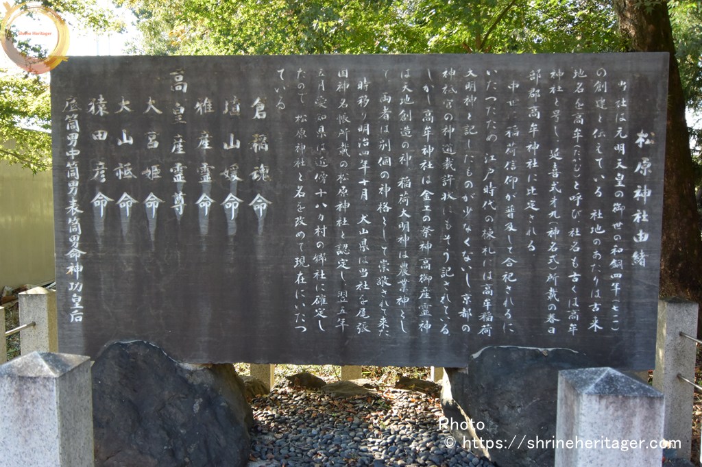 松原神社(まつばらじんじゃ)は 元明天皇の御代 和銅四年(711)創建と伝え 社地の辺りは古来地名を高牟(たかむ)と呼び 社名も古くから高牟神社と号し 延喜式内社 尾張國 春日部郡 髙牟神社(たかむの かみのやしろ)とされます 中世に稲荷信仰が普及して合祀され 江戸時代の棟札には高牟稲荷大明神と記したものがあります