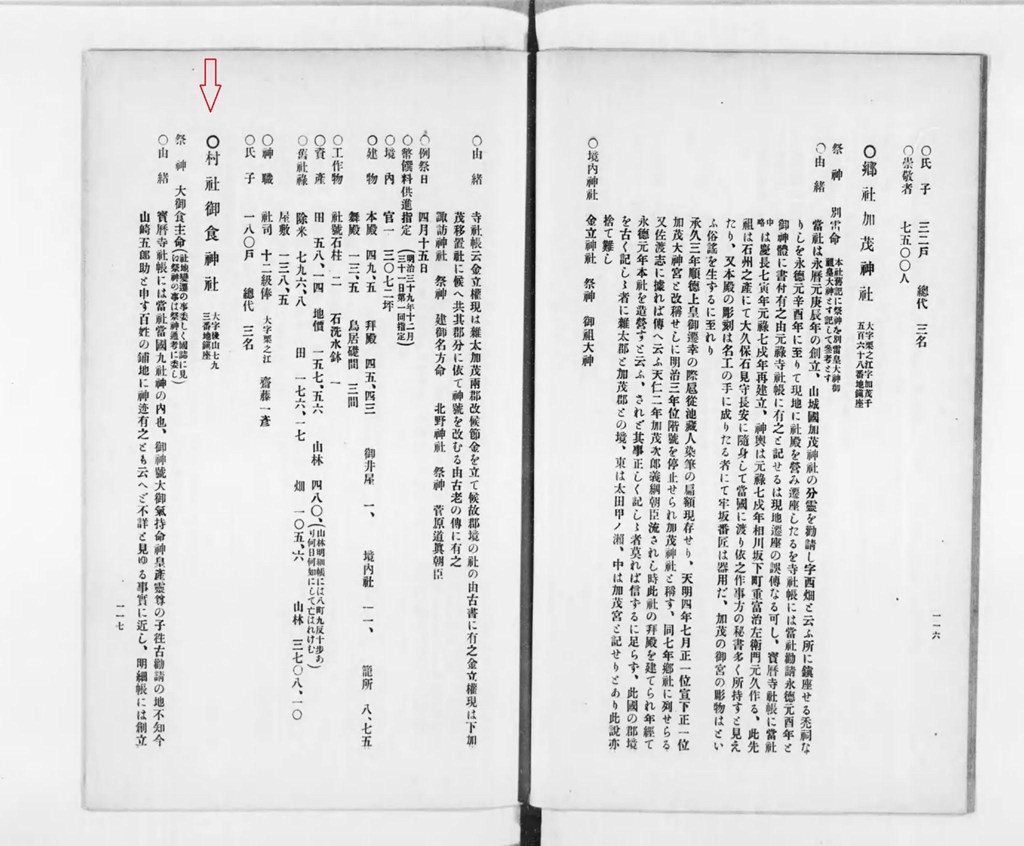 今按 佐渡志に木村に神祟あるよしにて形ばかりの小祠あり 修驗某いつき奉ると云へり されど元祿撿地帳に見えざれば如何あらん 又 同郡竹田村大膳の社 即 御食神社なりと古き物に記したり 古へ通はして大膳神とも云たるを後に御食の名を失ひて大膳明神とのみ稱しけるにやと云る 大膳明神こそ御食神社なるべけれ されど今 佐渡志にも明細帳にも後山村と云へければ姑く之に從ふ