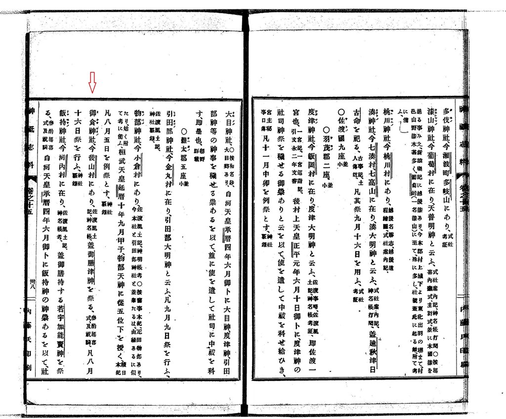 新潟県神職会佐渡支部 編『佐渡神社誌』,新潟県神職会佐渡支部,大正15. 国立国会図書館デジタルコレクション https://dl.ndl.go.jp/pid/971197
