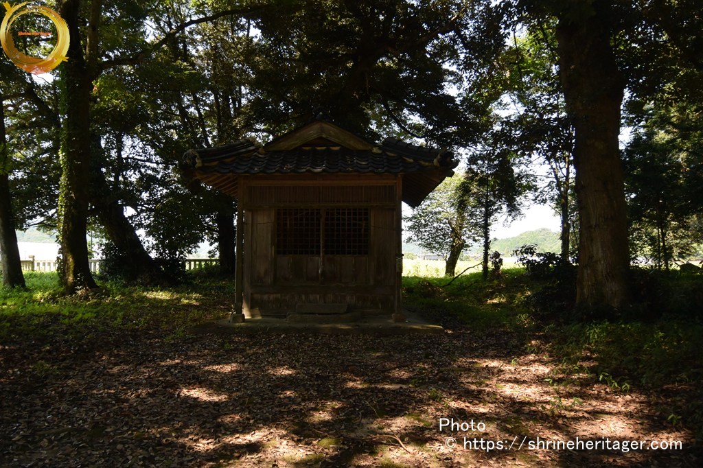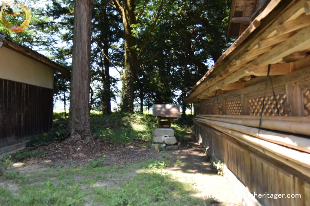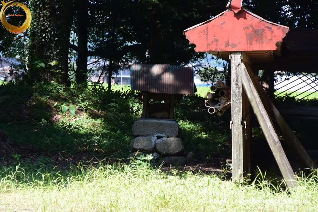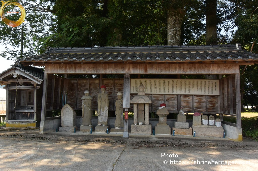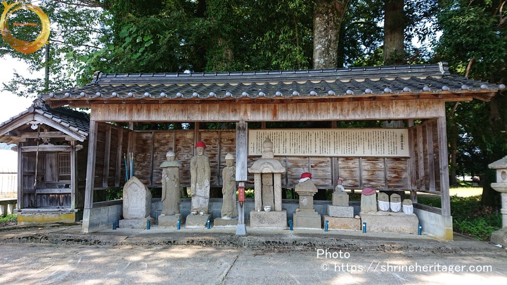 その左側の小祠は、基盤整備の際、小字イカシマ三五七番地付近より現地に移転されたもので、内部に五輪塔の水輪と六地蔵の刻まれた石幢(せきどう)の龕部(がんぶ)が祭られている。この六地蔵は神宮寺地蔵菩薩と伝承されており、当初祭られていた位置が神宮寺の跡とも推察される。