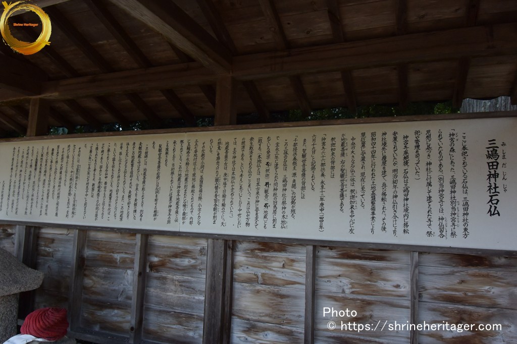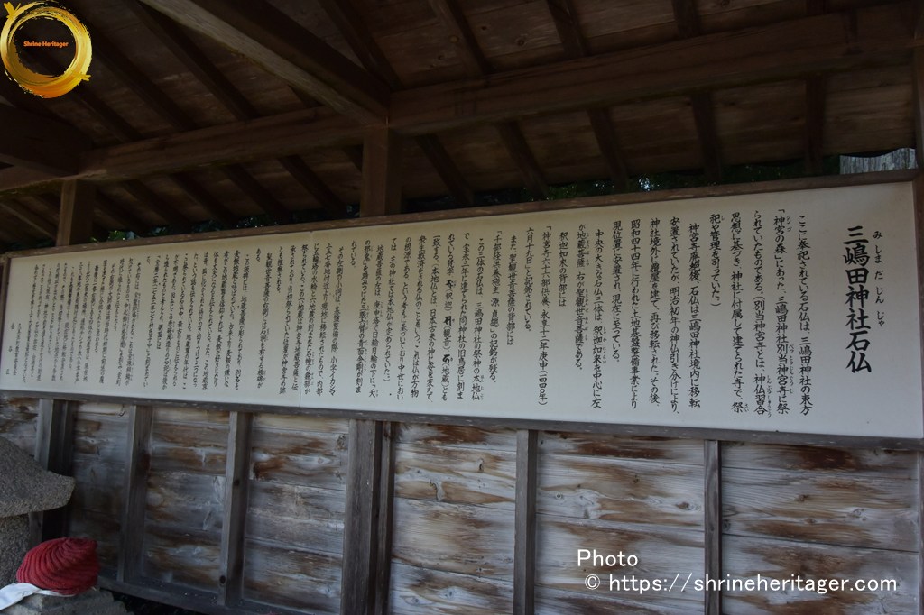 ここに奉祀されている石仏は、三嶋田神社の東方「神宮(ジンゴ)の森」にあった、三嶋田神社 別当神宮寺(べっとうじんぐうじ)に祭られていたものである。(別当神宮寺とは、神仏習合(しんぶつしゅうごう)思想に基づき、神社に付属して建てられた寺で、祭祀(さいし)や管理を司っていた。)