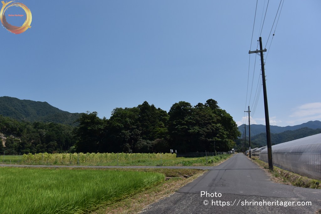 前方の左手に こんもりとした鎮守の杜が見えてきました