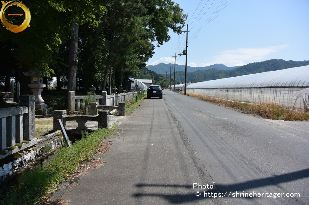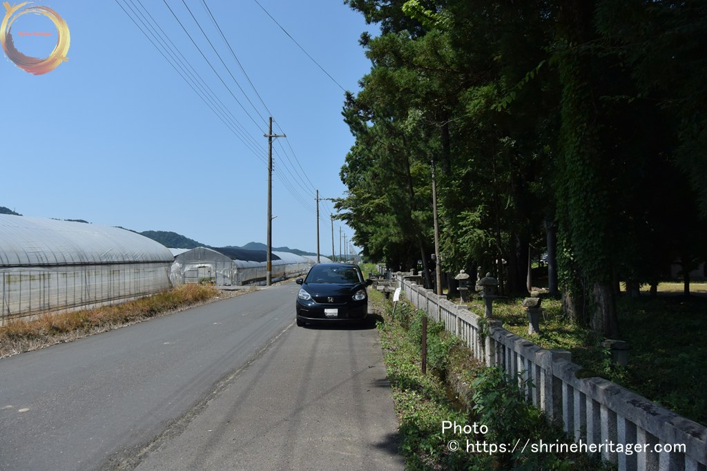 道幅も広く 交通量も少なく 神社の玉垣の前にレンタカーを路駐