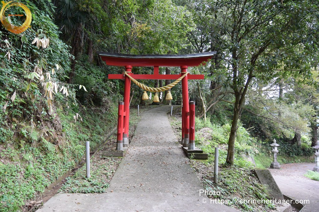 一の鳥居は東向き 参道はつづら折れとなっていて 朱色の両部鳥居が二の鳥居として 南を向いて参道に建ちます