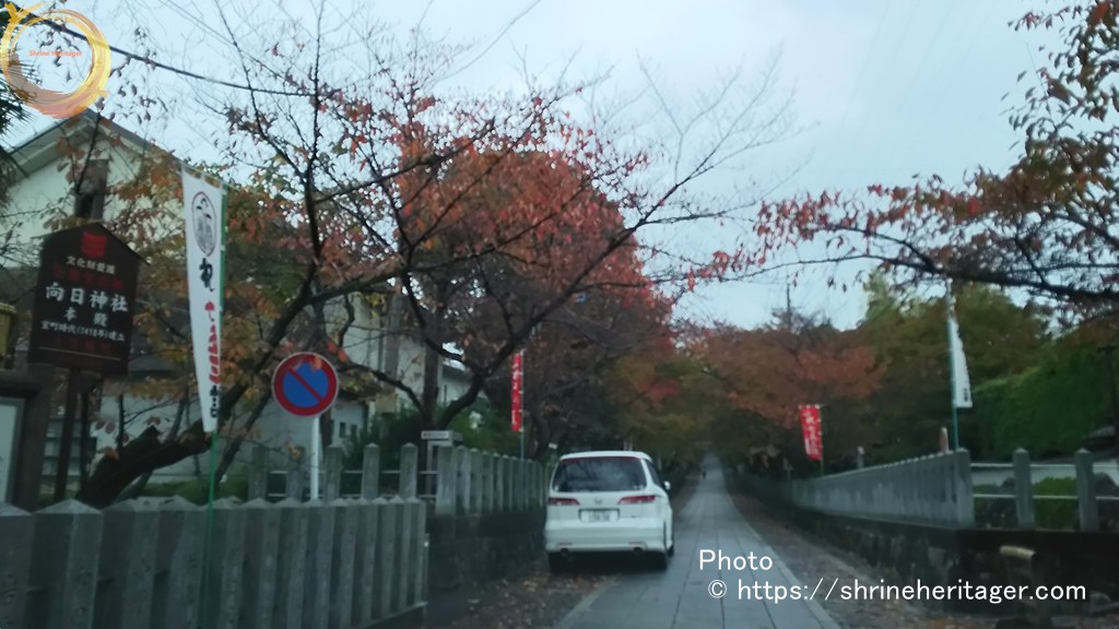 「文武天皇 大寶二年七月、雨を祈るに徹験あるを以て大幣月次祭に預り〔續日本紀〕、聖武天皇 天平七年四月神封六石を奉る〔新抄格勅符〕、光仁天皇 寶龜五年六月鹿狼の怪あるにより幣を奉り、桓武天皇 延暦三年十一月、兵都大輔大中臣朝臣諸魚を遣して従五位下に叙され、更に使を遣はして社殿を修理せしめらる〔續日本紀〕、文徳天皇 嘉鮮三年七月正五位下に敍され、清和天皇 貞観元年正月従四位下を授け、七月神寶幣帛を奉り、醍醐天皇 延喜の制、名神大社に列り、月次新嘗祈年案上 及 祈雨の奉幣に預らしむ〔延喜式〕、向神は素戔鳴尊の御孫 大歳命の子にしして、古くは向日神と書けども、今其の社の在る所を向日(ムカフ)町と稱せり、覈録に祭神 向日神〔神祇拾遺〕向日町に在す、古事記傳に「古事記、大歳神娶ニ 活須毘神之女 伊怒比賣、生子 白日神」とある白は向の誤なる由を云ひ、又 土佐日記に、「影とのみ頼むかひありて露霜に雨かはりせぬ神のみやしろ」とあり、又 中務内侍日記にも「なつかしむ心を知らば行くききに迎ひの神のいかが見るらん」などありて、向日は皆 牟加比に記せり、廣隆寺縁起に「山城園乙訓郡 乙訓社〔今 向日明神也〕昔彼社前有ニ 一木、有ニ 一人樵夫、以ニ 此杌(きりかぶ)作ニ 佛像、云々」とあるは、實は乙訓社の事にて、此社の事ならぬ由 覈録に論せり。清和天皇 貞觀元年正月正六位上 向神に従五位下を授く〔三代実録〕明治十年三月鄉社に列し、尋いで十年六月式内社と定められ、同十四年四月府社に昇格す、社殿は本殿、拝殿、社務所、御供所、神樂所等を具備し、境内は一萬二千百六十二年(官有地第一種)あり、地高くして眺望に佳なり。