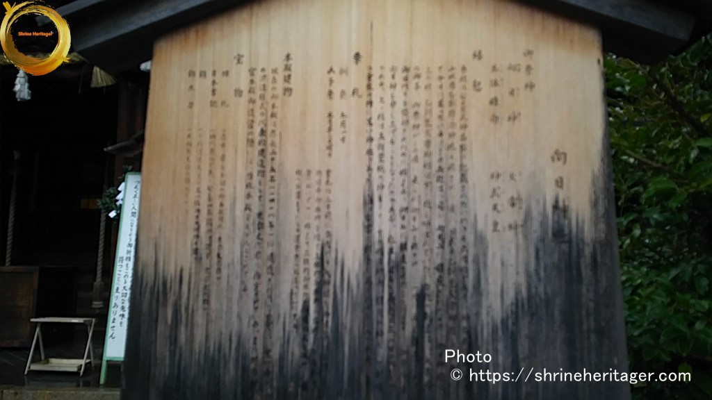 素戔嗚尊孫 大年神の子 向日神を祀る、〔古事記、舊事記、参取神名帳頭注、○按 古事記舊事記並に白日神に作る、然れども 延喜式 向神に作り、本社の傳説 又 大年神の子 向日神を祭ると云ひ、又 本社の北に大歳神社ある時は、白日の向日なる事ますます明かなり、故 延喜式 及 社傳に依て之を訂せり〕