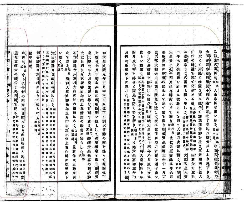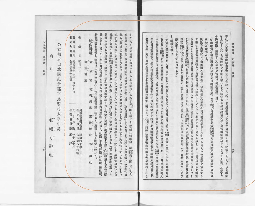 在る山背国乙訓郡 火雷神は 毎旱(ひでりごと)祈雨(あめをいのる)頻有(しきりにあり)徴験(しるし) 宜(よろしく)大幣(おおぬさ)及 月次幣(つきなみごへい)の例(たとえ)に入(はいるべし)