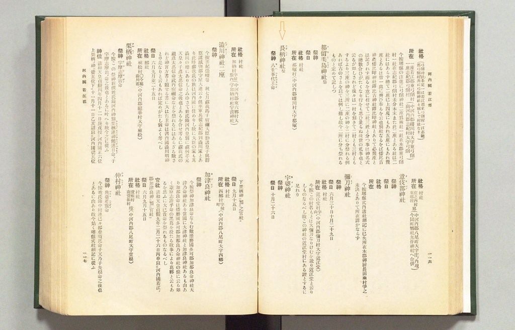 式内社 長柄神社について 所在は゛庄之内村 東郷村 界(中河内郡八尾町大字庄ノ内 現今同町 郷社 矢作神社へ合併)゛〈現 長柄神社跡(八尾市東本町) 現今 矢作神社(八尾市南本町)に合併された〉と記しています
