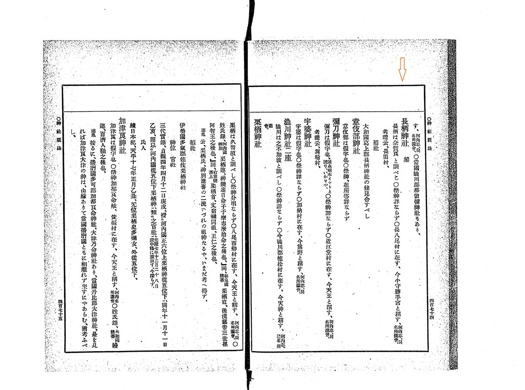 式内社 長柄神社について 所在は゛今 庄之内村 東郷村の堺にあり゛〈現 長柄神社跡(八尾市東本町)〉と記しています