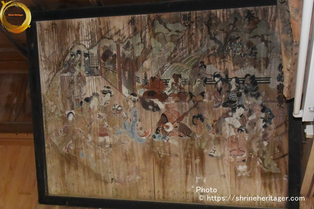又 特殊神饌として洗米に黒豆、刻み菖蒲を混ぜた「ウブコメ」を供え「オサン」と称する役掌によってお産の行事があり、氏子繁盛、安産祈願と共にお産の難易を占う神事である。境内社