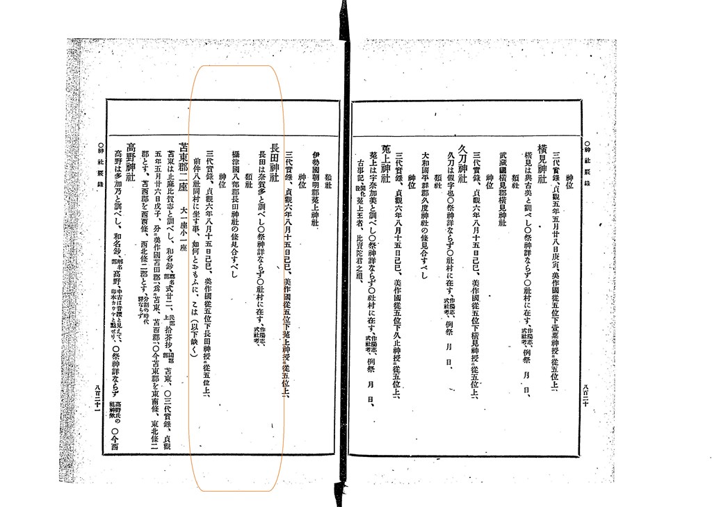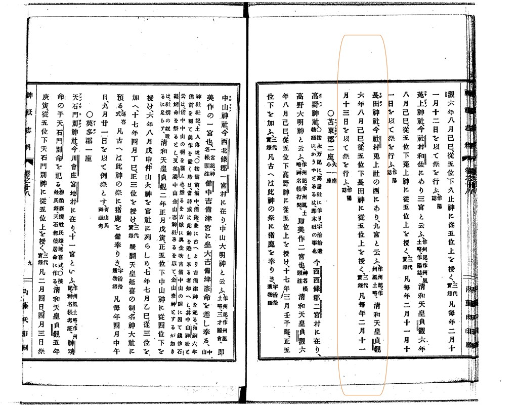 三代實錄、貞觀六年八月十五日己巳、美作國 從五位下 長田神 授ニ從五位上、前件八社同村に坐す事、如何とおもふに、こは(以下缺く)