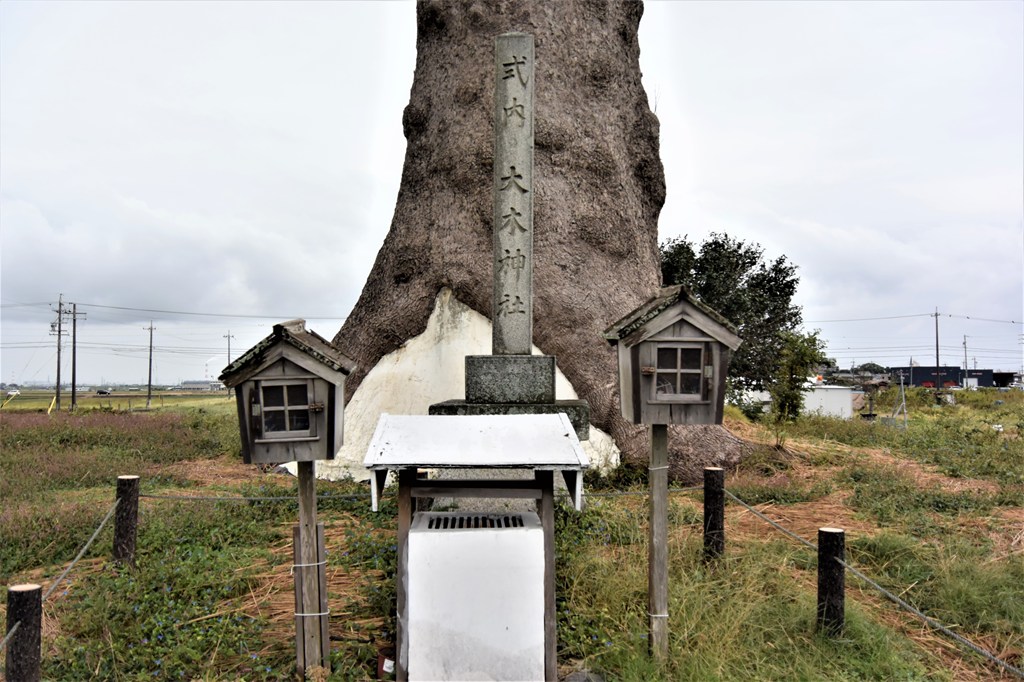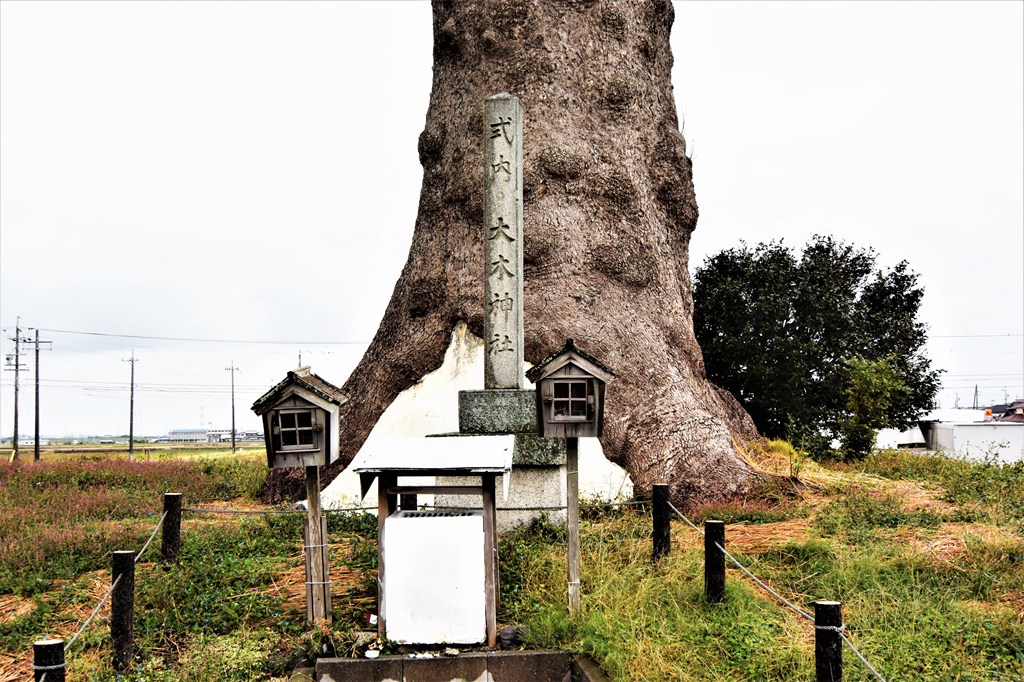樹齢は不明ですが、全国的にも有数の大木です。樹高二十六メートル、目通り直径二・九メートル、枝張りは東西三十メートル、南北三十五メートルです。むかし、この木のもとに延喜式内社大木神社があったといわれています。