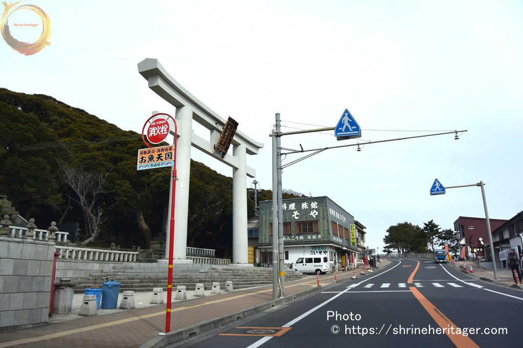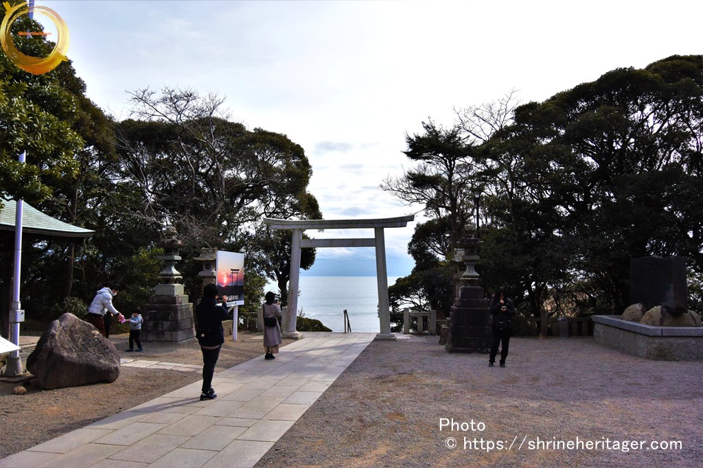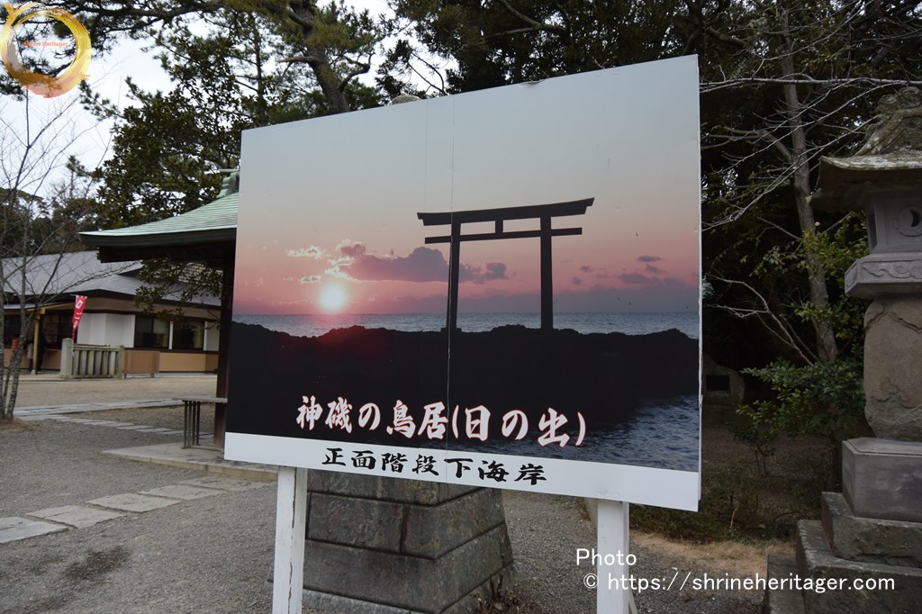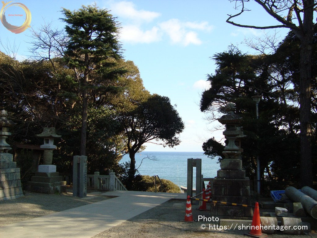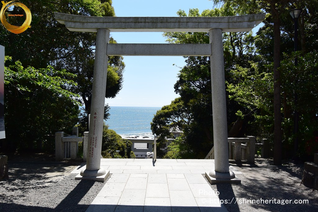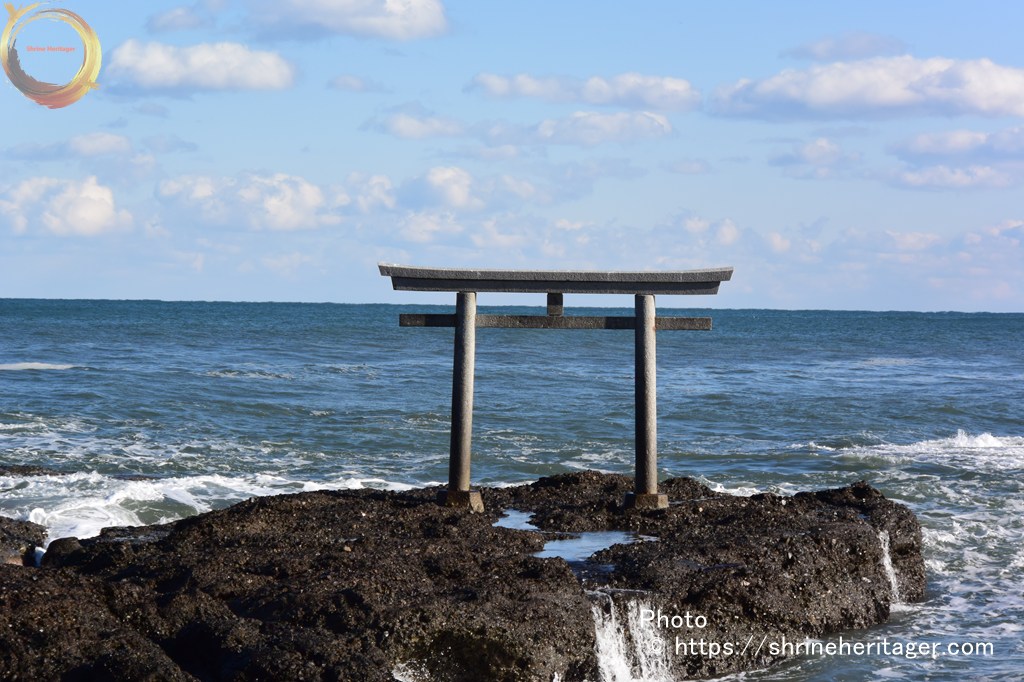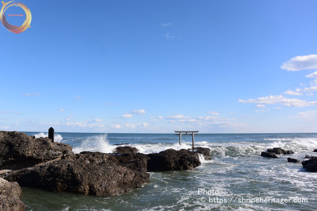 御祭神が降臨されたと伝わる磯を「神磯(かみいそ)」と称し 神聖な場所として禁足地(足を踏み入れてはいけない場所)に建つ鳥居