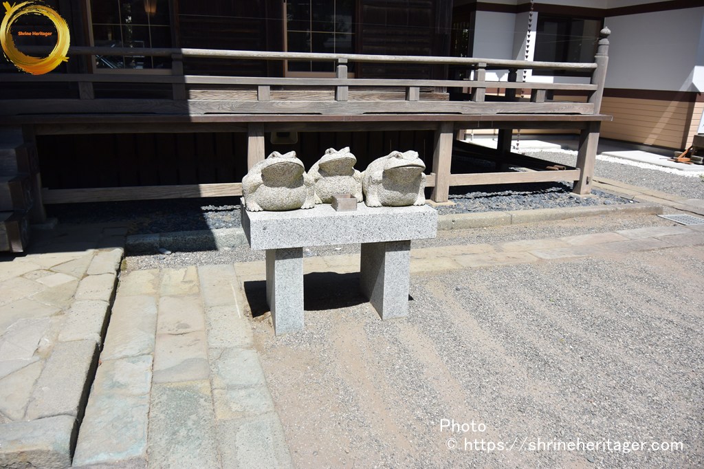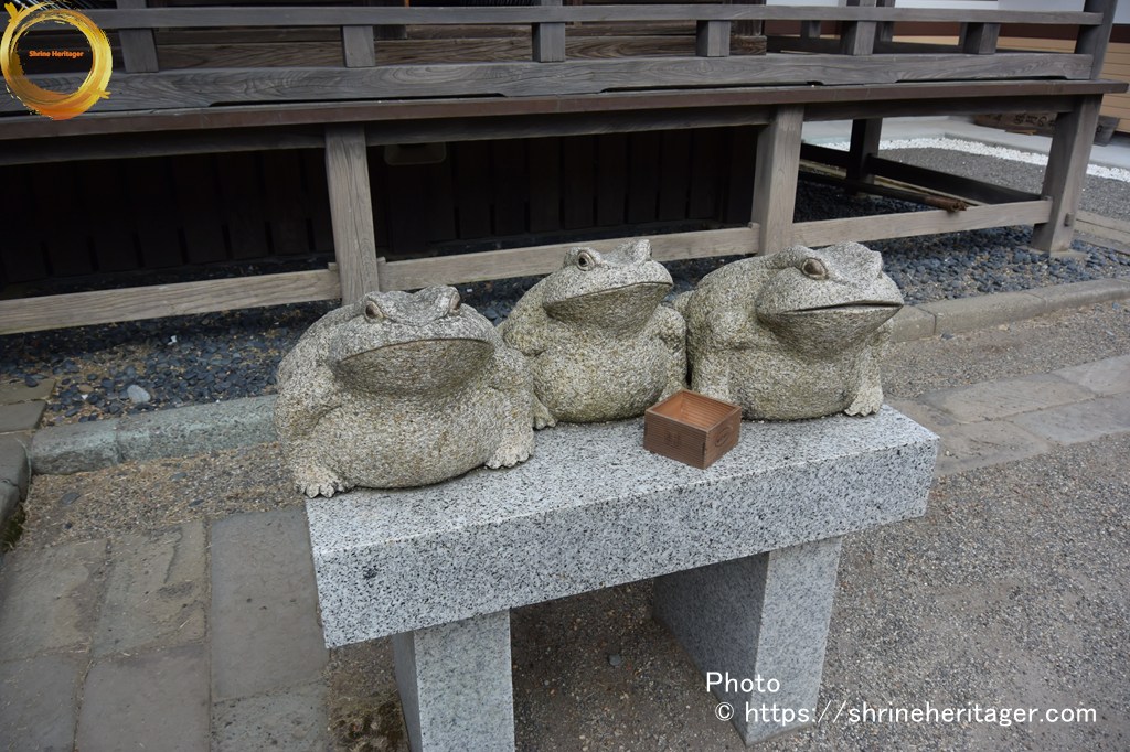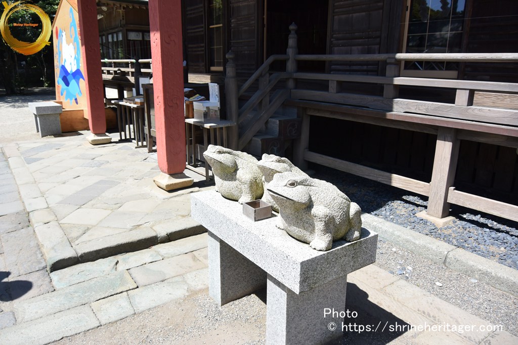 拝殿の前には カエルの石像〈少彦名命の神使い〉が置かれています
