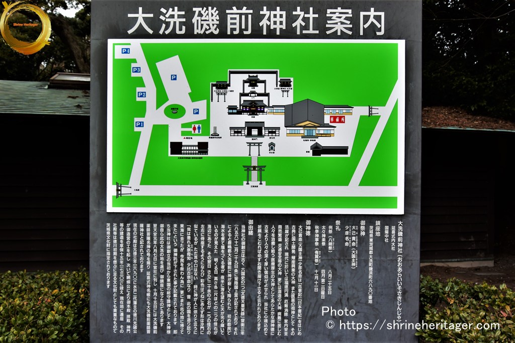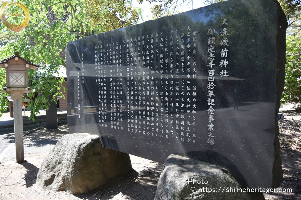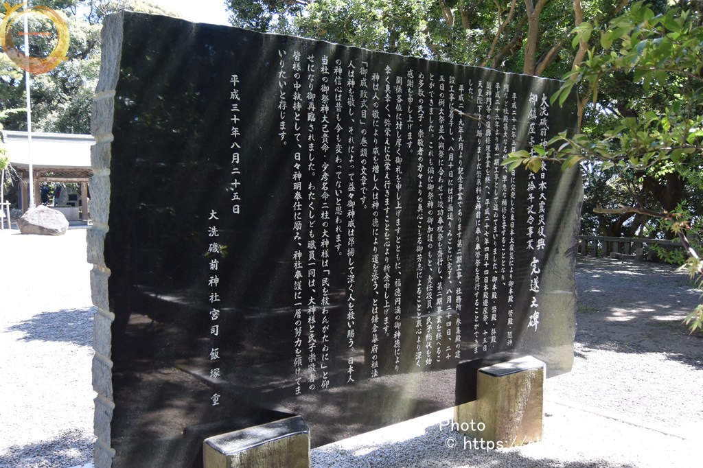 当神社の御創立は古く 六国史の一つ『文徳天皇実録』斉衡三年(856)十二月二十九日に常陸国上言が記されており それによると鹿島郡大洗磯前に神が新しく降りられた 初め郡民で海水を煮て塩をつくる者が 夜半に海を望むと天が光り輝いているのが見えた 明くる日 高さ各一尺ほどの二つの怪石が海辺にあった その翌日 さらに二十余の小石が 二つの怪石の左右に侍座するようにならび 彩色はつねにあらず形は沙門に似ているが ただ耳や口はない 時に神が人に依りて云うに「我は大奈母知(おおなもち)少比古奈命(すくなひこなのみこと)なり 昔 此の国を造り訖り 東海に去ったが 今民を済わん為に 更にまた此の地に帰って来た」という 御神託が下された事が記載されております 即ち当神社は御創立の当初から東国の総守護神として 大神様御自ら此の大洗の地を選び 御鎮座になったのであります