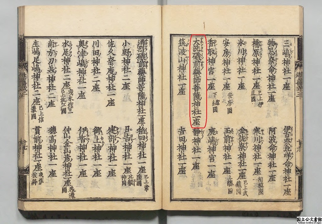 故 天安元年八月辛未、官社に預らしめ、十月已卯、藥師菩薩名神の號を授け給ひ、〔文徳実録〇按本社 及 酒列二社、、古へ 醫藥の方を定め給ふ事ありしに依て、藥師(ヤクシノカミ)とも云ひしを、其字音の佛名に由緣あるより、菩薩の号を加へたるにや、大凡甚も尊く恐き天神地祇に、彼穢く汚はしき佛号を加ふる理あるへくもあらさるを、二社また宇佐神などに加へ奉るは、中世以降 本地垂迹の説起りしより、天下おしなべて佛を祟むる事 神の如くなりし風習なりしかは、彼穢き名を加ふるをも、怪しとはせず、却てよき事のごとく思ひし故なるへし、姑附て考に備ふ、〕
