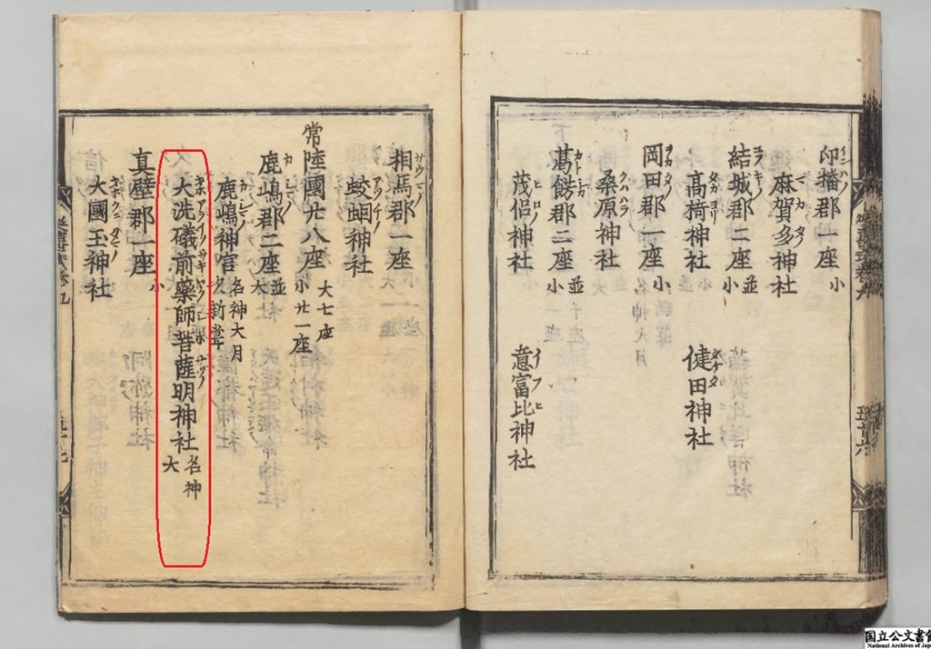 〇式三、〔臨時祭〕名神祭二百八十五座、〔中略〕常陸國 大洗磯前藥師菩薩神社一座、