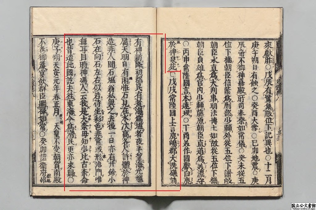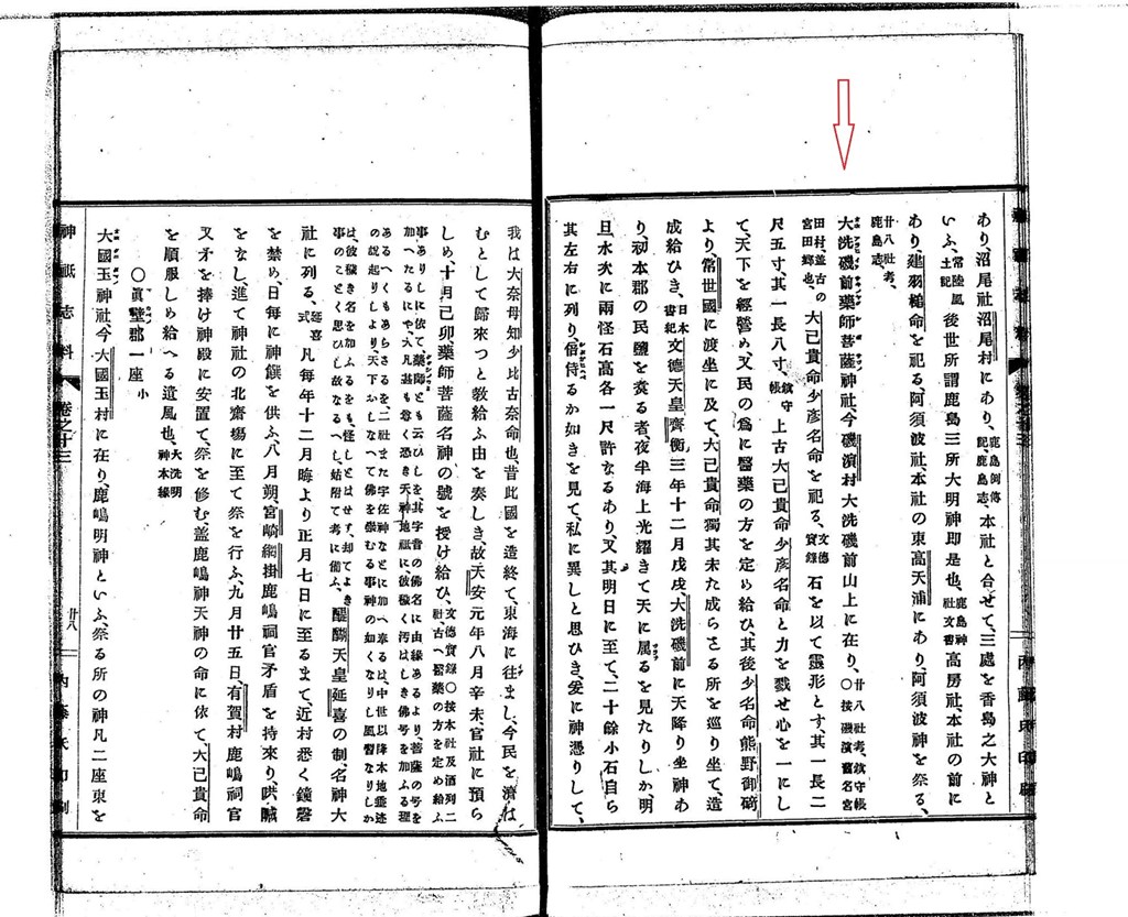 文徳實録、斎衡三年十二月戊戌、常陸國上言、鹿島郡 大洗礒前有 神新降、初郡民有ニ 煮海爲鹽者、夜半望海、光輝属天、明日有ニ 兩怪石、見在ニ 水次、高各尺計、體ニ 於神造、非ニ 人間石、塩翁私異 之去、後一日、亦有ニ 廿餘小石、在ニ 向石左右、似若ニ 侍坐、彩色非常、或形ニ 沙門、唯無ニ 耳目、時神憑人云、我是大奈母知少彦名命也、昔造ニ 此國訖、去往ニ 東海、今為濟民、更亦来歸、