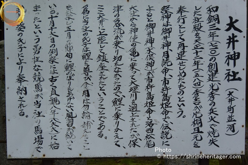 祭神は御井神、月読神、市杵島姫命で、伝説によると御井神(木俣神)が市杵島姫命と洛西松尾 大社から神使の亀に乗って大堰川を遡上されたが、保津の急流が乗り切れなかったので、鯉に乗りかえて、ここ大井に上陸して鎮座されたということである。