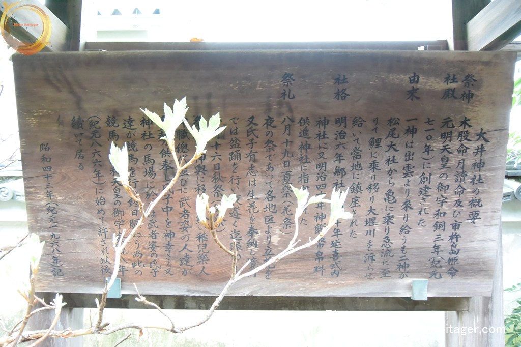 大井神社(おおいじんじゃ)は 和銅3年の創建。祭神の木俣命が保津川を鯉に乗って上がってきたと伝えられ、通称「鯉明神」といわれています。この地域ではでは鯉を神の使いと考えられ、鯉を食べず、鯉のぼりも揚げない風習が伝わっています