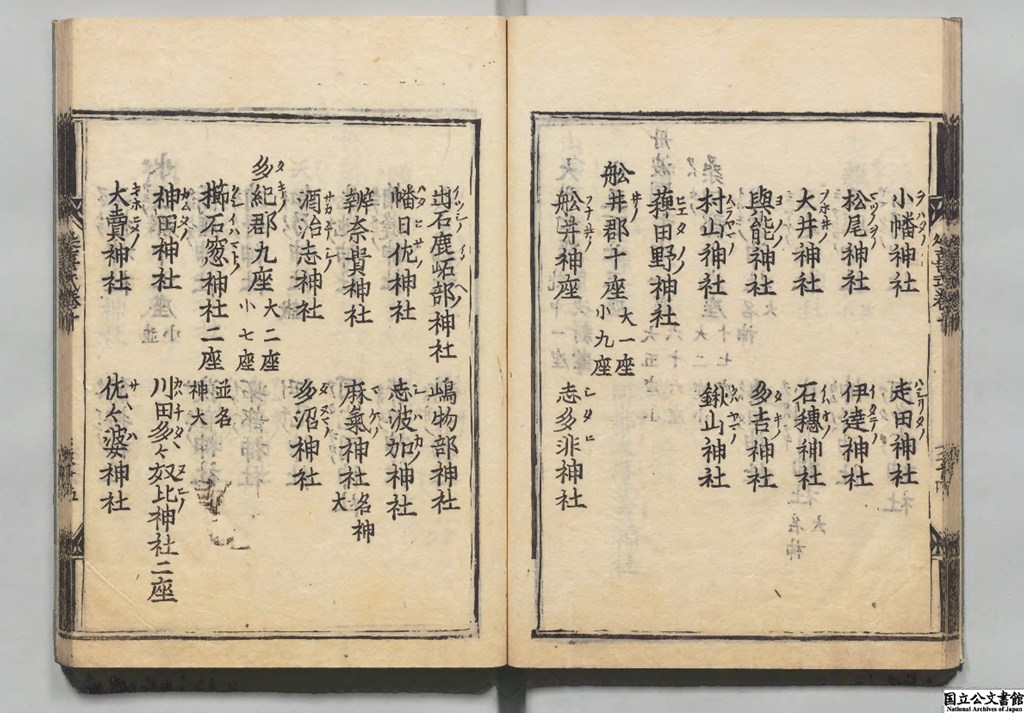 その中でも巻9・10を『延喜式神名帳(Engishiki Jimmeicho)』といい 当時〈927年12月編纂〉「官社」に指定された全国の神社(式内社)の一覧となっています