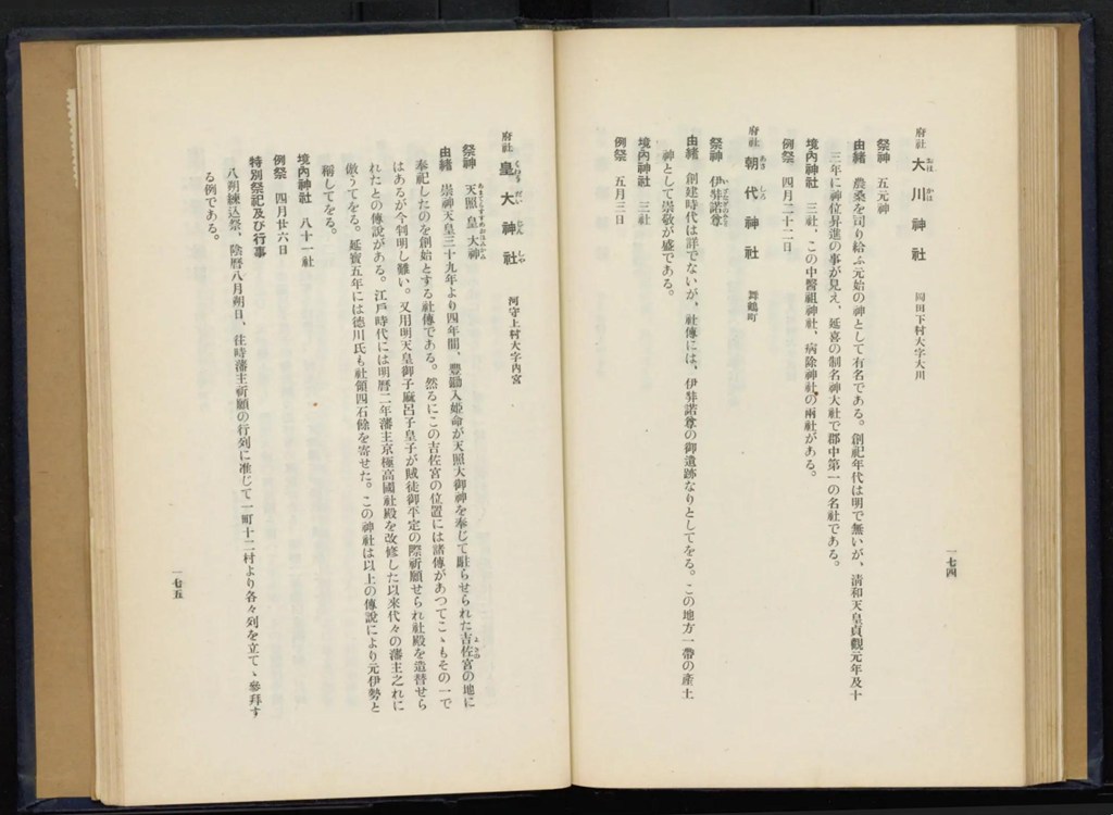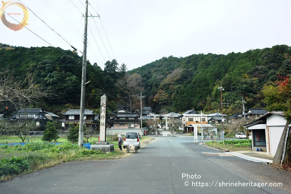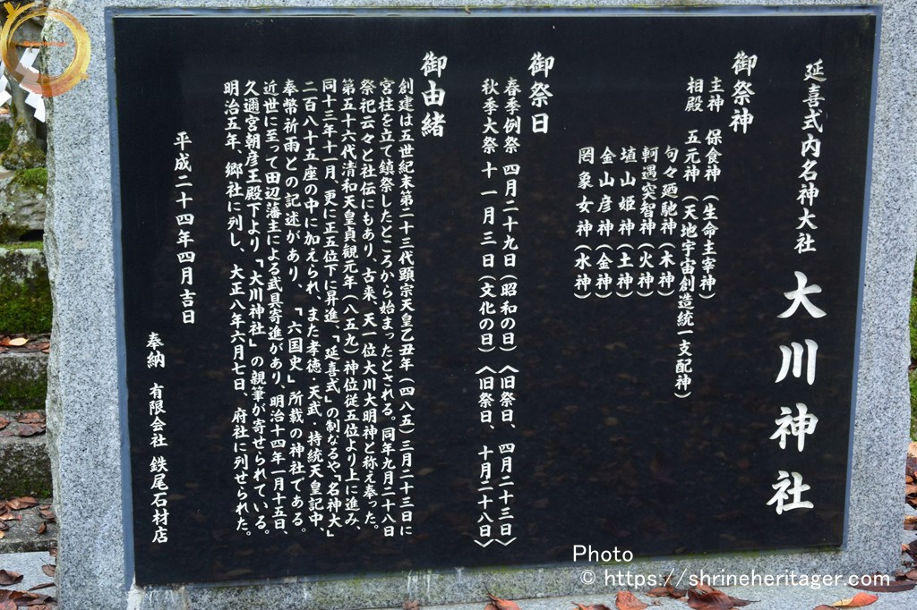 【式考】大川村社 傳緣起ニ神アリテ 漁父ニ憑託シ玉ヒテ 宣ハク吾將サニ穀蠶ヲ護ラン祠ヲ設クベシト 依テ大川村ニ宮柱太敷立テ鎭祭ル由ミエタリ、祭神若宇賀能賣神ナルベシ