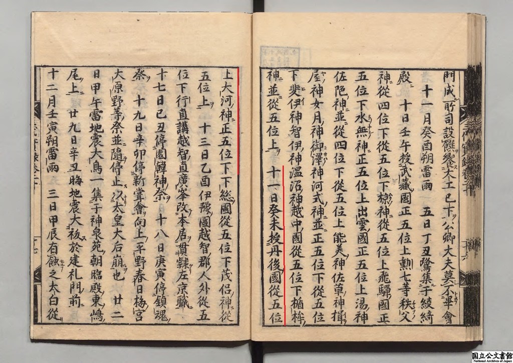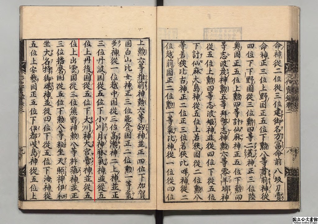〇【三實】貞觀元年正月廿七日丹後國從五位下大川神從五位上 〇同十三年十ー月十一日從五位上大川神正五位下