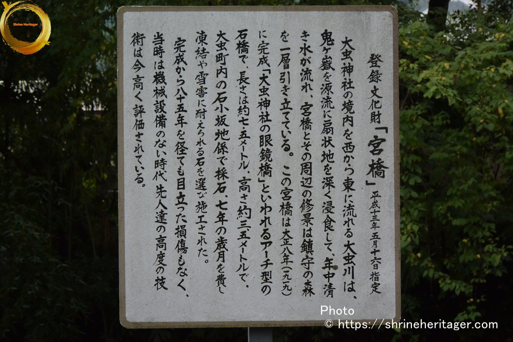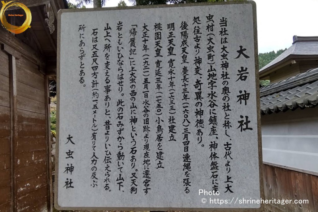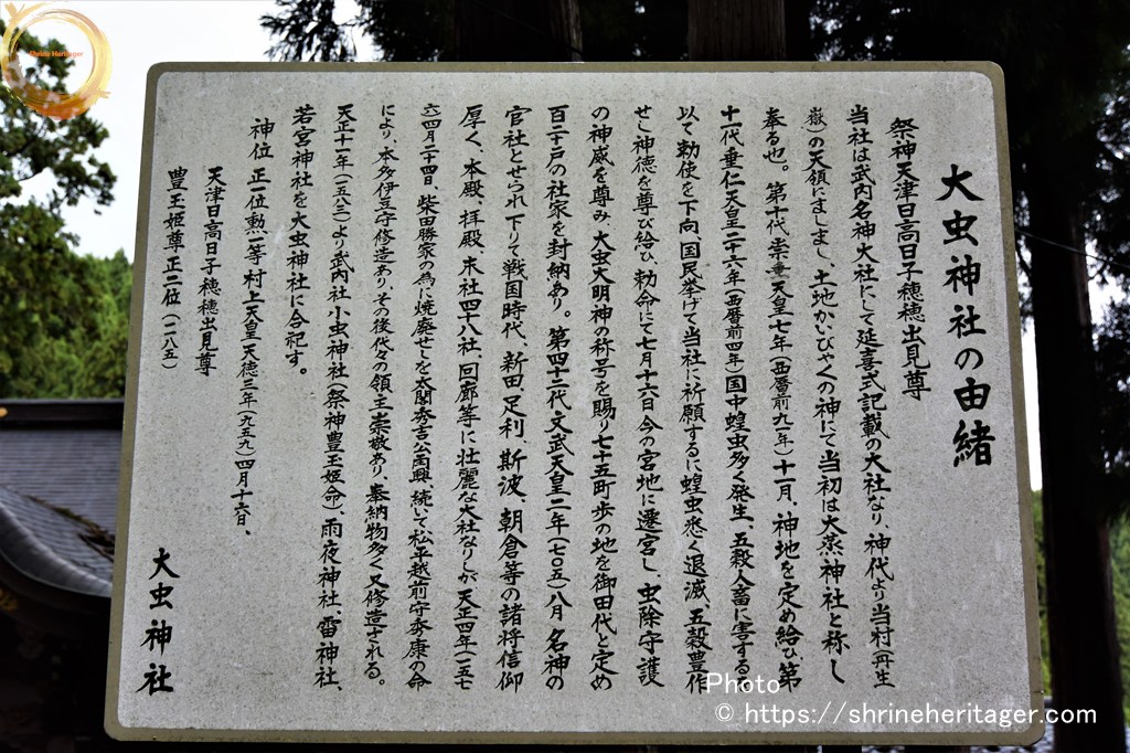 当社は式内名神大社にして延喜式記載の大社なり。神代より当村(丹生嶽)の天領にましまし、土地かいびゃくの神にて当初は大蒸神社と称し奉る也。第十代崇神天皇七年(西暦前九一年)十一月、神地を定め給ひ、第十一代垂仁天皇二十六年(西暦前四年)国中 蝗虫多く発生、五穀人畜に害するを以て 勅使を下向、国民挙げて当社に祈願するに蝗虫悉く退滅、五穀豊作せし神徳を尊び給ひ、勅命にて七月十六日今の宮地に遷宮し、虫除守護の神威を尊み、大虫大明神の称号を賜り七十五町歩の地を御田代と定め百二十戸の社家を封納あり。